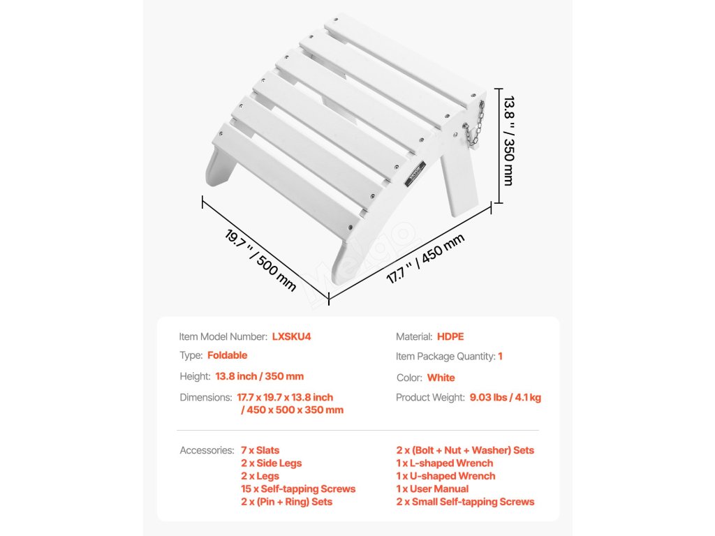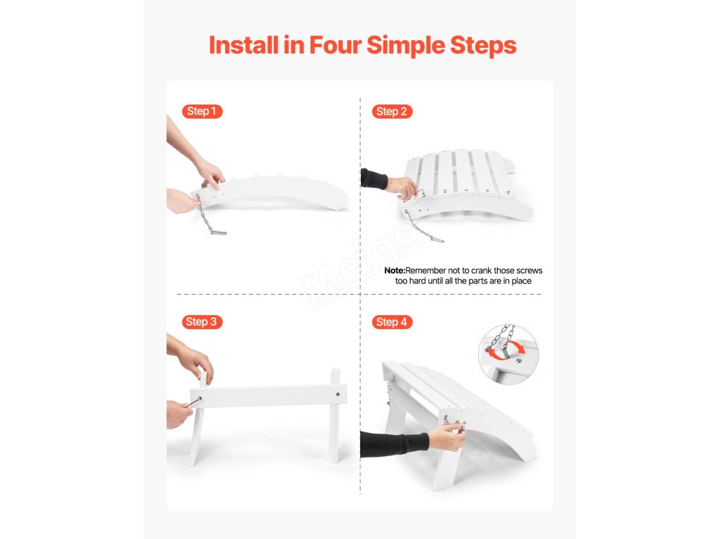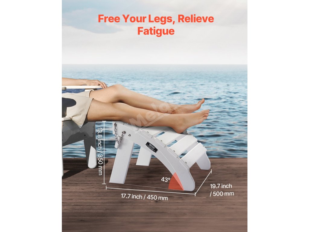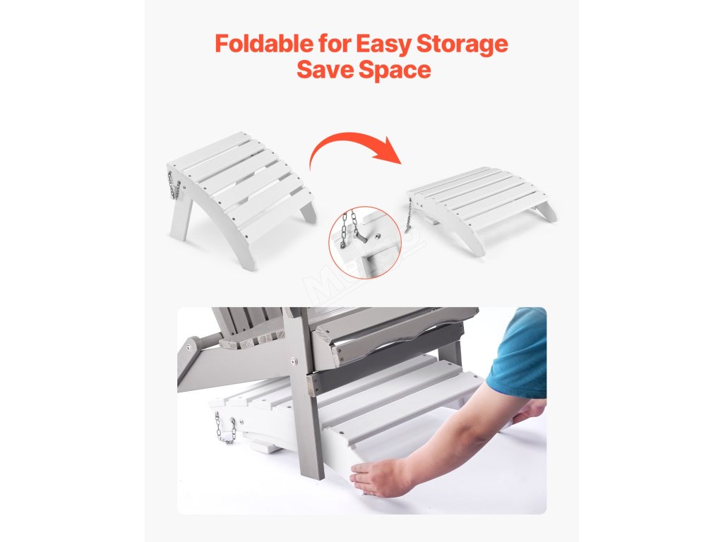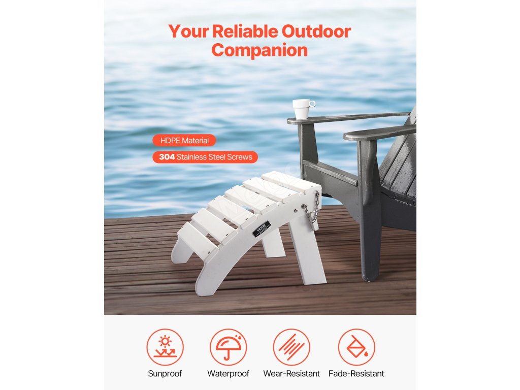 Otoman Adirondack je vyroben z odolného materiálu HDPE se šrouby z nerezové oceli 304 odolné proti korozi. Je skládací pro snadné skladování, instaluje se ve 4 krocích a má pohodlnou výšku 13,8 palce s úhlem 43 stupňů. Ideální pro různá venkovní prostředí.