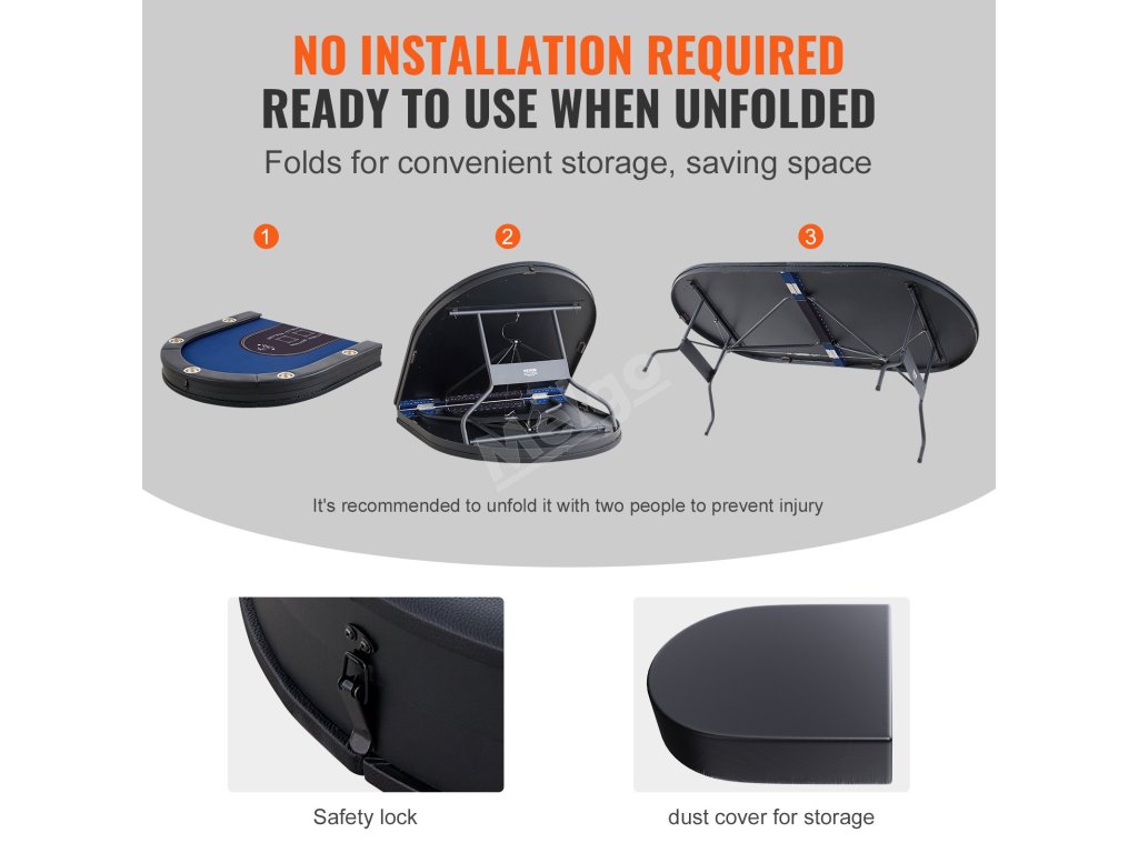 Oválný stůl Casino Leisure Table se snadno sestavuje a pohodlně přenáší a skladuje. Zabudovaný bezpečnostní zámek bezpečně zabraňuje sklopení nebo uvolnění. Dodáváme také protiprachový kryt pro snadné použití v době, kdy se nepoužívá, a udržuje se tak v čistotě.