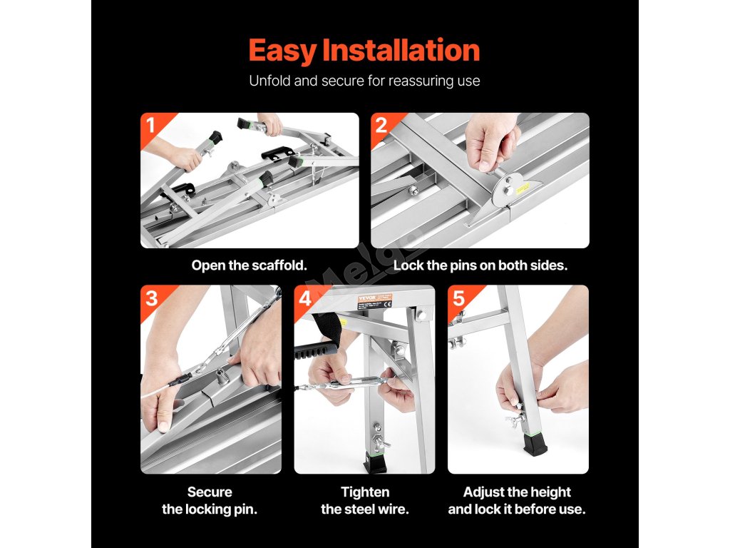 Prenosné lešenie VEVOR je navrhnuté na jednoduchú prepravu, takže je ideálne na všetky projekty na stavenisku alebo na domáce úpravy pre domácich majstrov. Jeho funkcia rýchleho zloženia šetrí čas, pretože vám umožní ho bez námahy premiestniť a uskladniť.
