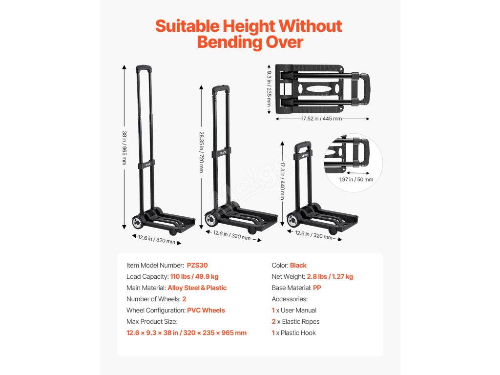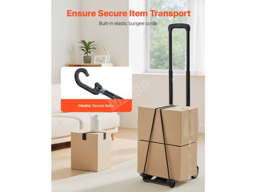 Náš skládací ruční vozík obsahuje elastické hákové popruhy pro zajištění předmětů během přepravy. Tato flexibilní funkce se přizpůsobí různým tvarům a velikostem a zabrání posunutí nebo převrácení předmětů.