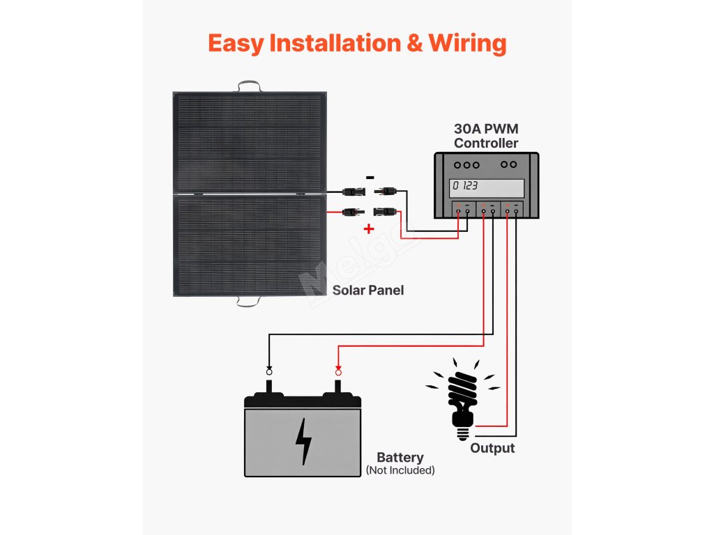 Náš monokrystalický solární panel je vybaven stabilním výstupem MC4, 30A PWM regulátorem a krokovými měniči, které umožňují snadné připojení k bateriím a zajišťují stabilní a konzistentní výstupní výkon.