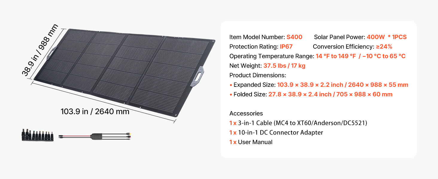 Skládací solární panel 400 W, monokrystalický 24% účinnost, IP67, MC4