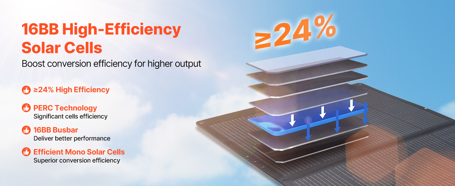 Tento solární panel s vysoce účinnými monokrystalickými solárními články 16BB s účinností konverze ≥ 24 % zachycuje více slunečního světla a poskytuje stabilní a konzistentní výstup energie, aby vaše zařízení byla neustále napájena.