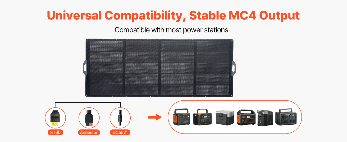 Náš monokrystalický solární panel je vybaven stabilním výstupem MC4, kabelem s konektorem MC4 3 v 1 (MC4 na XT60/Anderson/DC5521) a adaptérem s konektorem DC 10 v 1, který je široce kompatibilní s většinou elektráren.