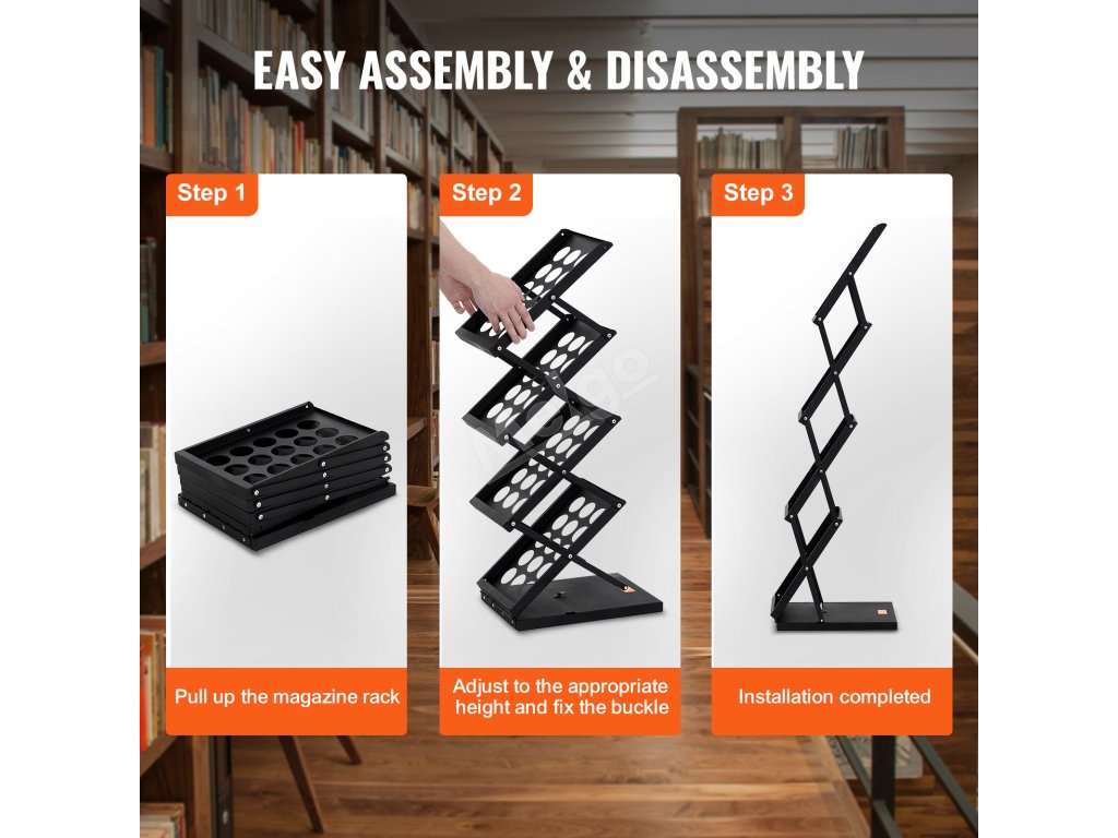 Tento podlahový stojan na časopisy s jednodílnou skládací konstrukcí se rozkládá a skládá během několika sekund bez nutnosti použití dalšího nářadí. Stojan na časopisy stačí vytáhnout, nastavit do vhodné výšky a připnout, čímž instalaci dokončíte.