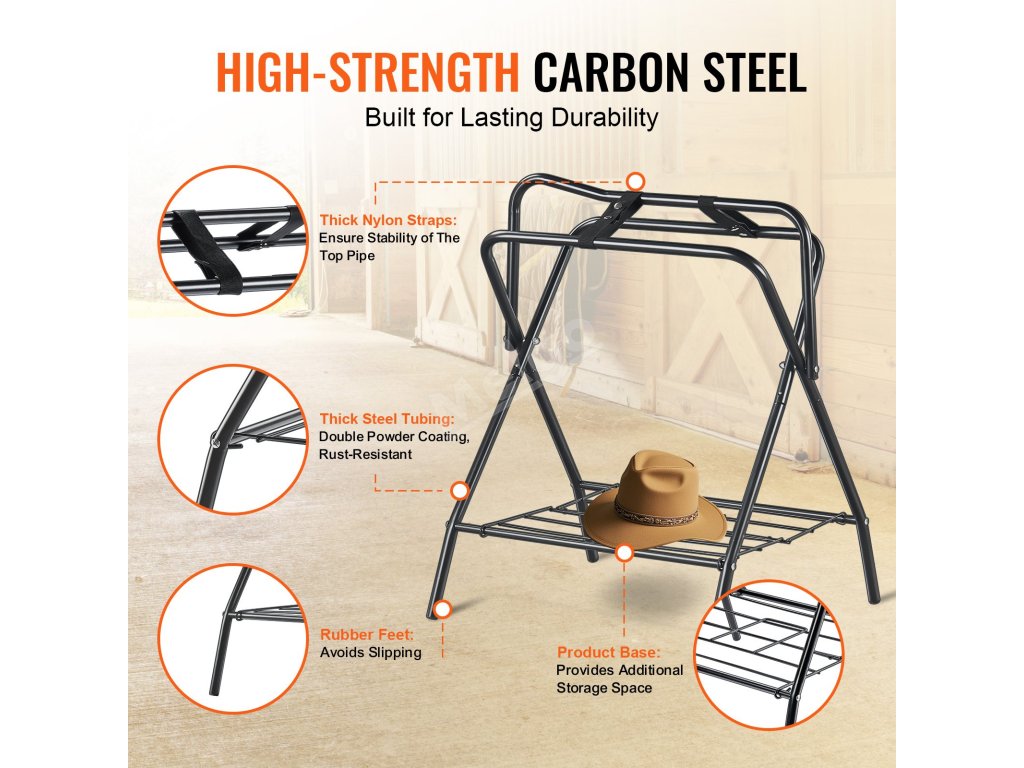Tento sedlový nosič se může pochlubit celoocelovou konstrukcí s plným svařováním pro zajištění odolnosti. Unese až 132 kg, pojme anglická i westernová sedla a zároveň udrží vaše sedla v pořádku. Díky nacvakávací konstrukci je instalace snadná a lze ji pohodlně složit, aby se ušetřilo místo!