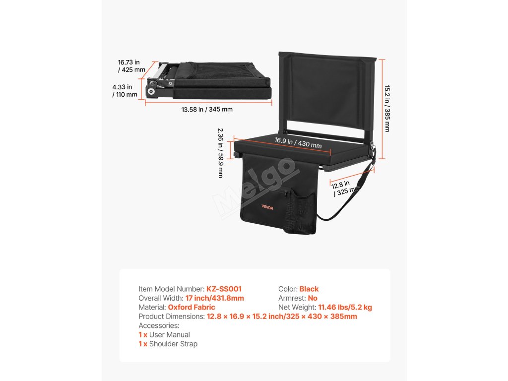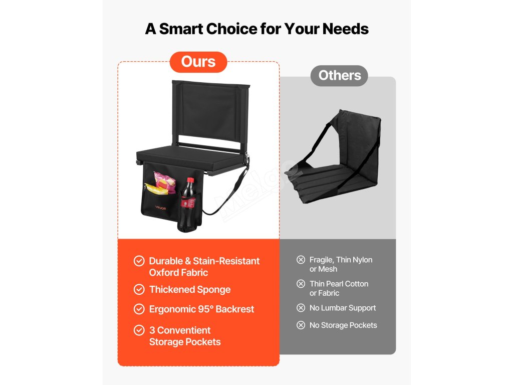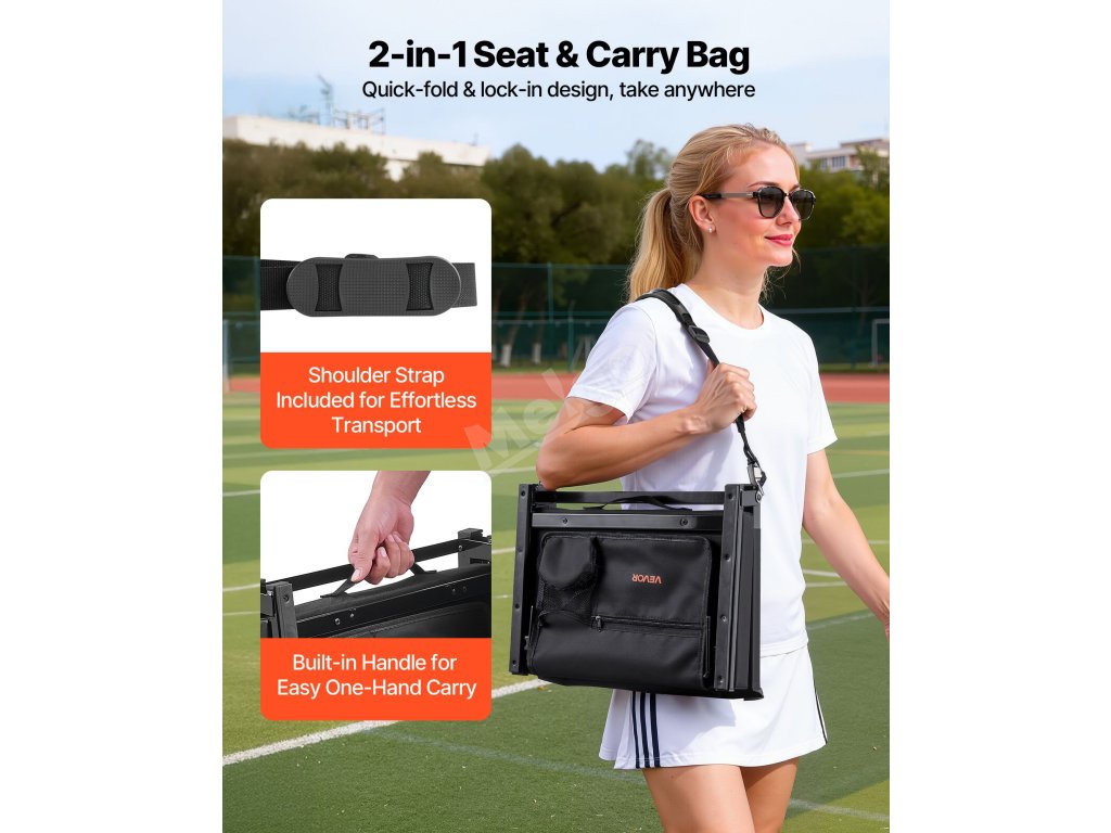 Toto odolné sedadlo na tribunu s opěradlem je vybaveno několika úložnými kapsami včetně přihrádky na telefon a zadní kapsy na nápoje, svačinu a kapesníky. Je vyrobena z lehké oceli, pěny s vysokou hustotou a nepromokavé tkaniny 600D Oxford, takže nabízí trvalé pohodlí a praktické využití na venkovních akcích.