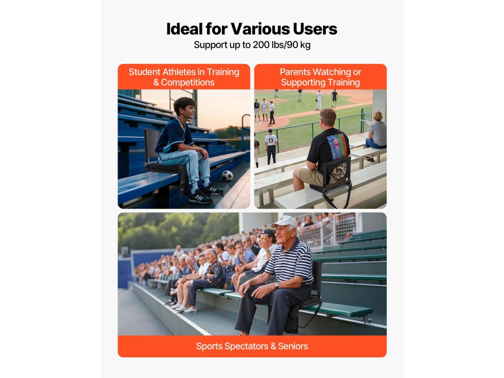 Tato skládací sedačka na tribunu je přenosná a spolehlivá, ideální pro studenty sportovce během tréninků, rodiče doprovázející tréninky a diváky na sportovních akcích nebo starší uživatele. Snadno se přenáší a skladuje a poskytuje pohodlné sezení doma nebo na venkovních setkáních.