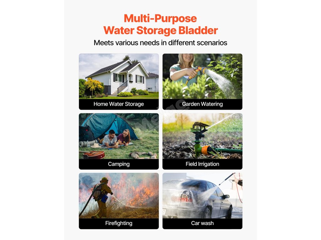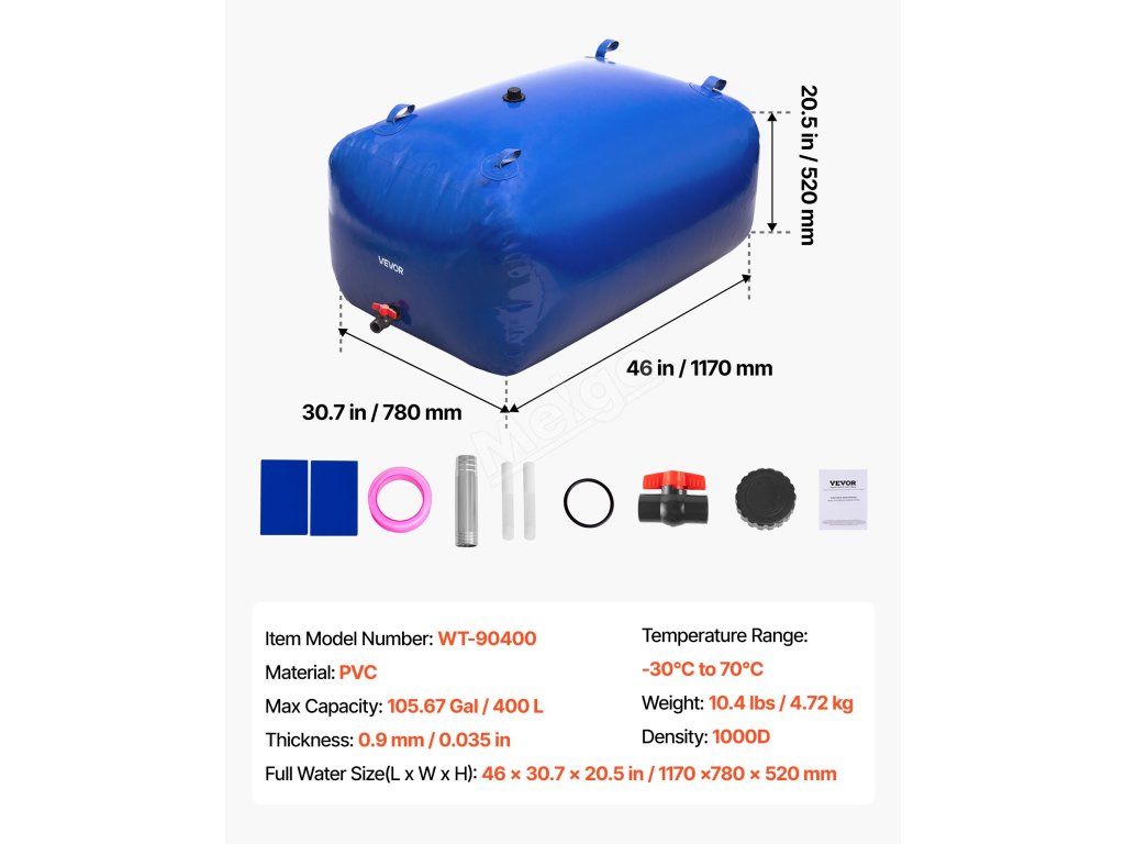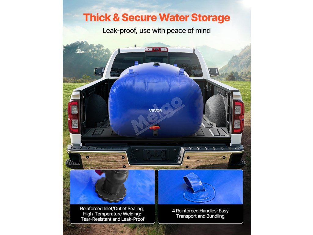 Tento skládací vak na vodu VEVOR o objemu 105,7 galonu/400 l je vyroben z odolného dvouvrstvého PVC materiálu 1000D, který zajišťuje vynikající odolnost. Jeho pevné těsnění a nepropustná konstrukce zajišťují spolehlivé skladování vody pro venkovní dobrodružství, domácí použití, zahradničení nebo nouzové situace.