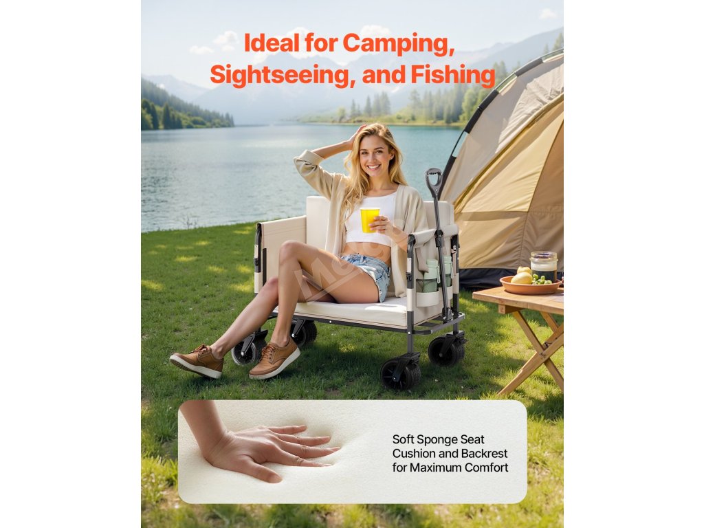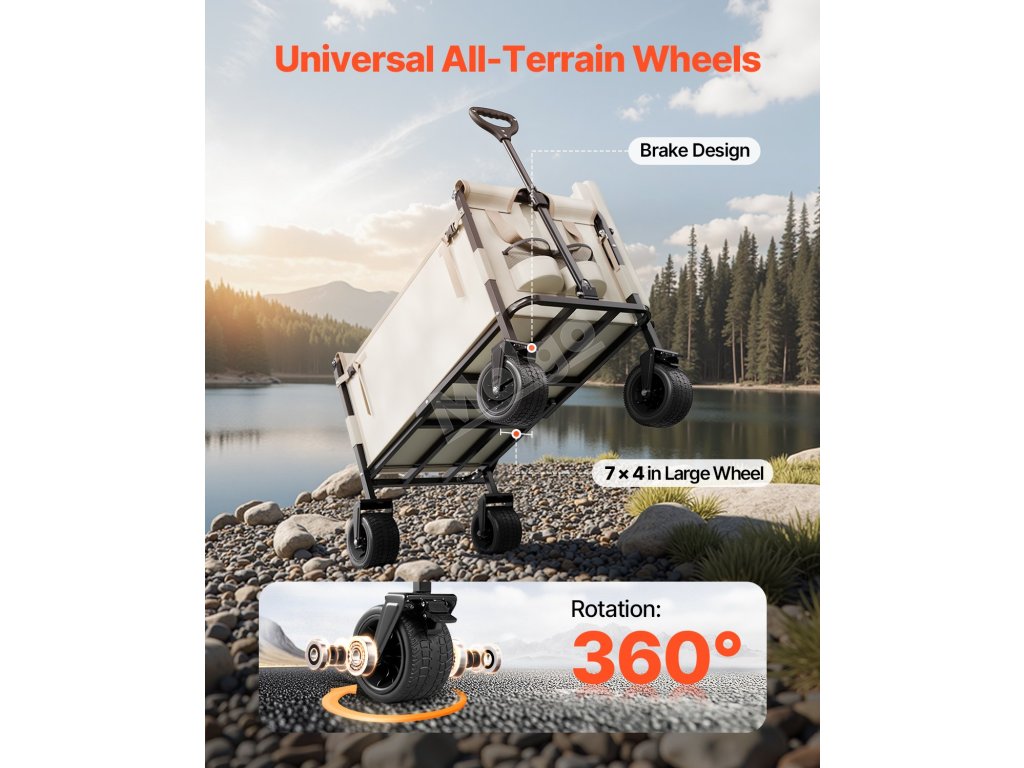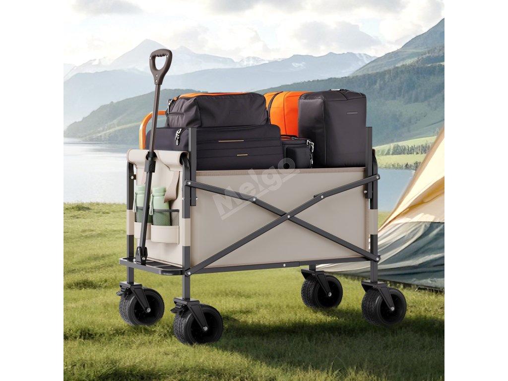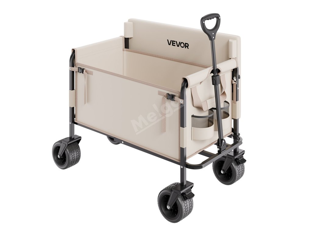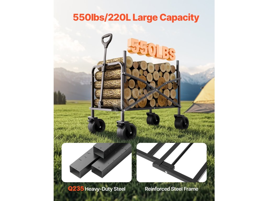 Tento skládací vozík kombinuje funkčnost vozíku a sedadla v jednom. Díky nosnosti 550 kg a prostoru o objemu 220 litrů se do něj snadno vejdou různé předměty. Kola o rozměrech 7 × 4 palce jsou navržena tak, aby zvládla jízdu v různých terénech, zatímco nastavitelná výška a řízení zajišťují hladké manévrování.
