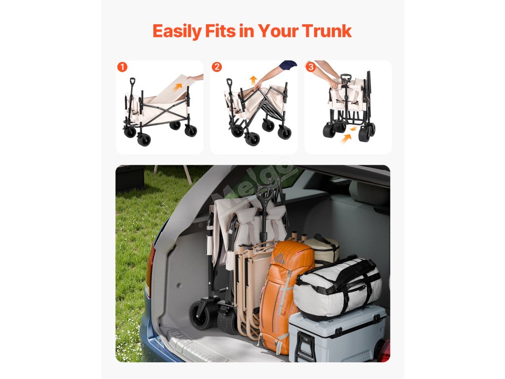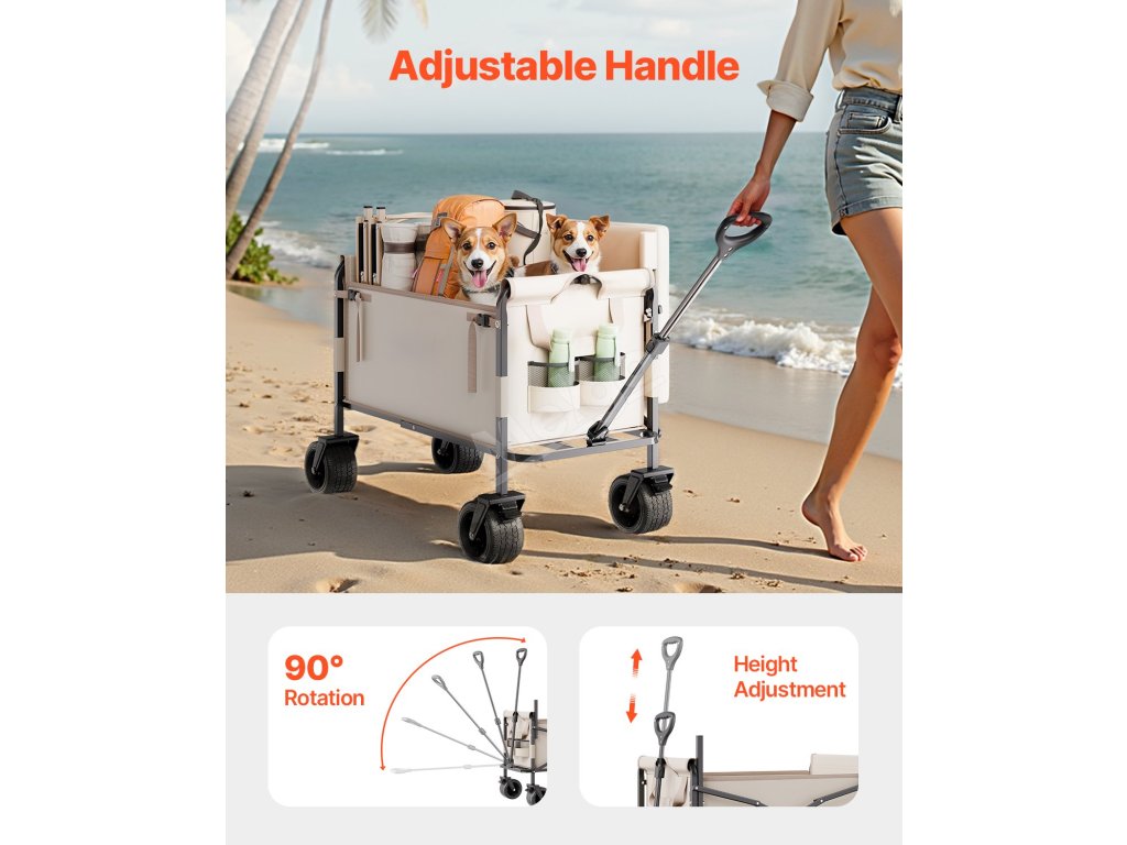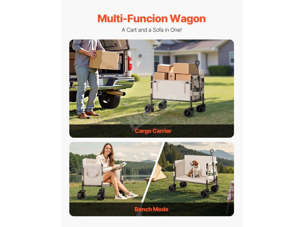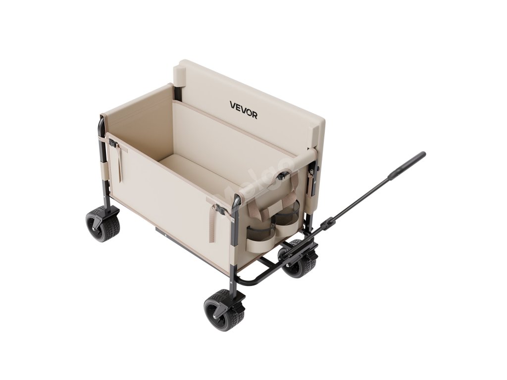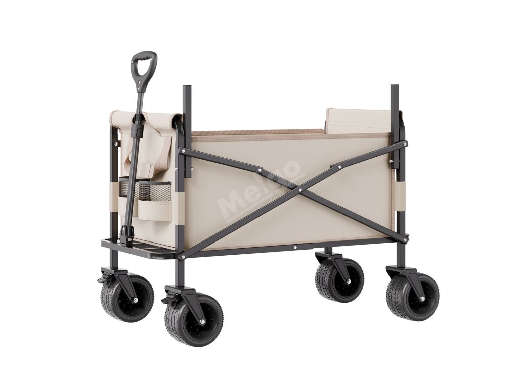 Tento skládací vozík kombinuje funkčnost vozíku a sedadla v jednom. Díky nosnosti 550 kg a prostoru o objemu 220 litrů se do něj snadno vejdou různé předměty. Kola o rozměrech 7 × 4 palce jsou navržena tak, aby zvládla jízdu v různých terénech, zatímco nastavitelná výška a řízení zajišťují hladké manévrování.