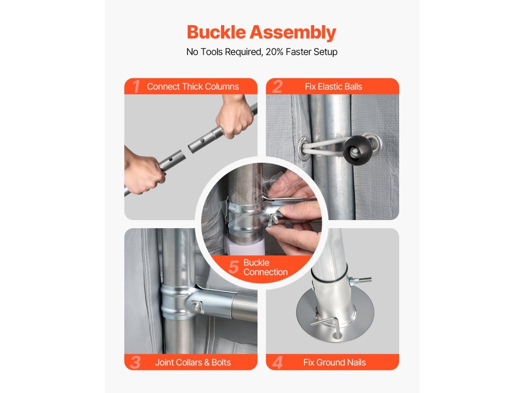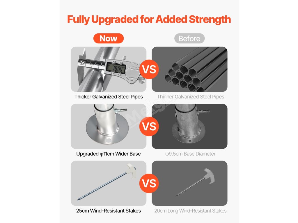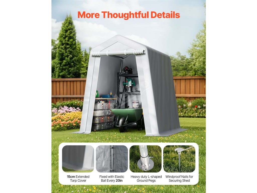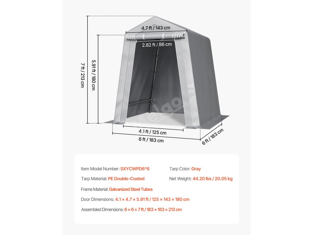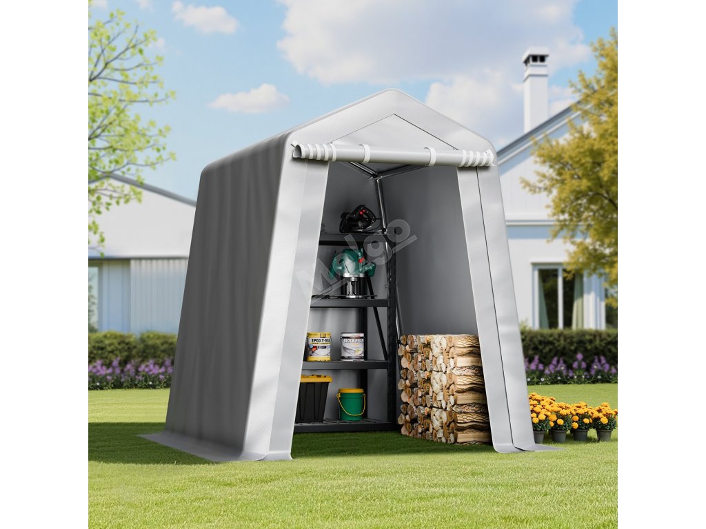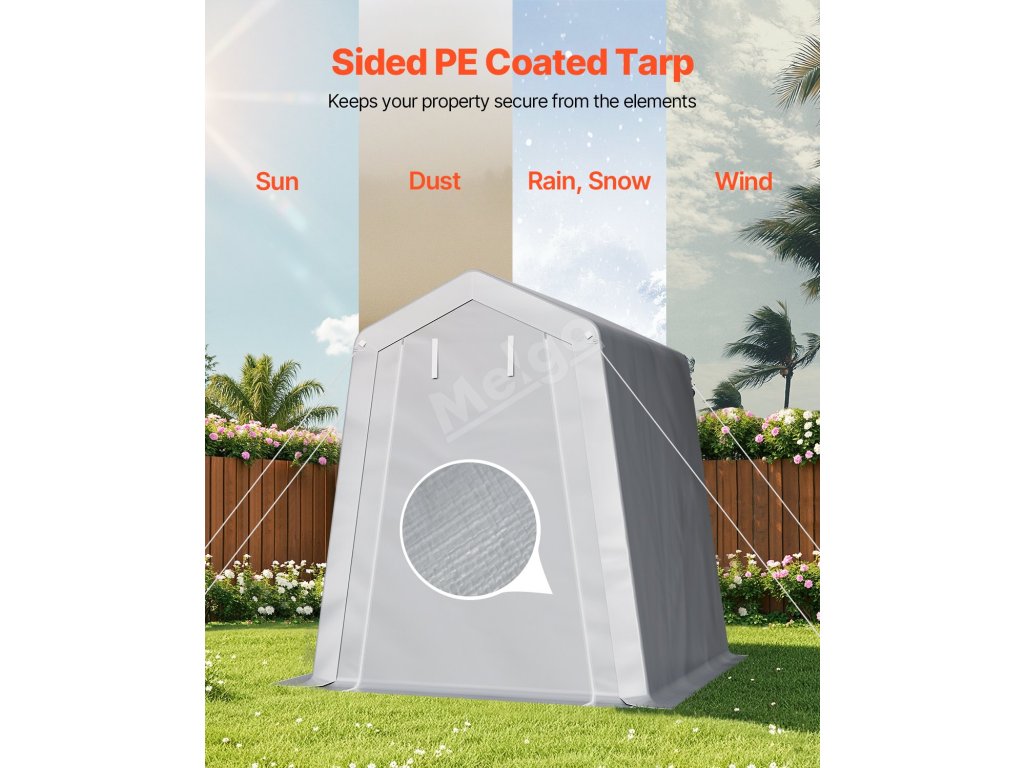 Tento skladovací prístrešok je vyrobený z 38 mm pozinkovaných oceľových rúrok a má obojstranne potiahnutú PE striešku odolnú proti slnku a vyblednutiu, ktorá zaručuje bezpečné skladovanie za každého počasia. Zipsové rolovacie dvere poskytujú súkromie a pohodlie. Ideálny na motocykle, záhradné náradie a všeobecné vonkajšie skladovanie.