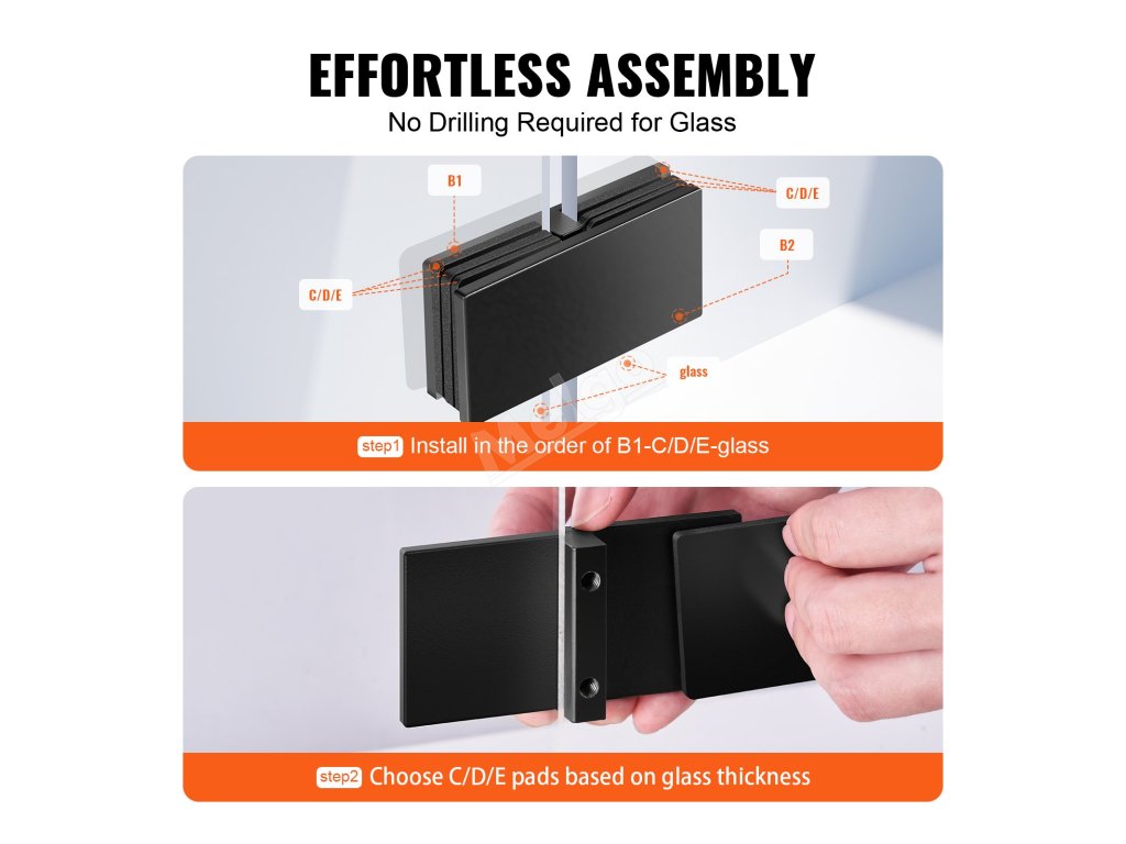 Sada pro upínání skla se dodává s rozsáhlým příslušenstvím, takže instalace je velmi pohodlná. Každá součást je navržena tak, aby dokonale seděla a zajišťovala bezpečné a stabilní nastavení.