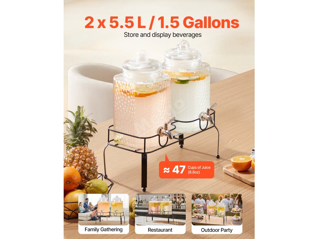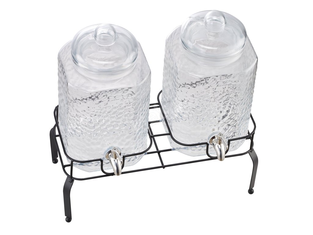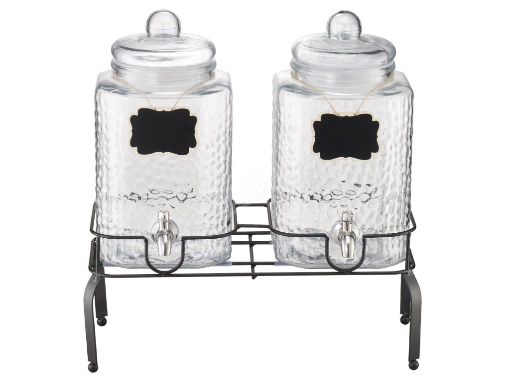 Skleněný dávkovač 2×5.5L s kovovým stojanem a nerezovým kohoutkem