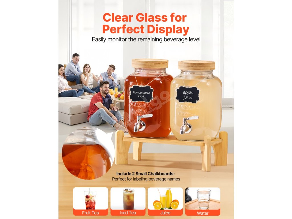 Priehľadný sklenený valec prehľadne zobrazuje hladinu nápoja, zatiaľ čo dizajn so širokým hrdlom uľahčuje dopĺňanie. Veko zabraňuje tvorbe prachu, stojan poskytuje stabilnú oporu a jednoduché dávkovanie a malé kriedové tabuľky sú ideálne na označovanie názvov nápojov.