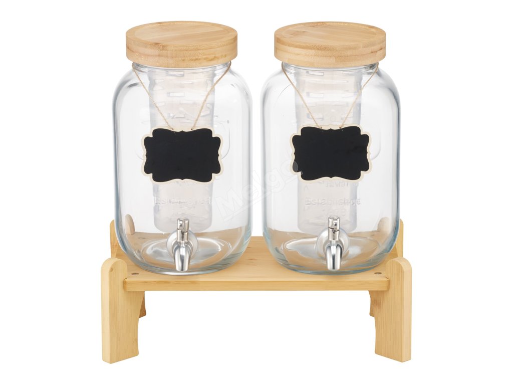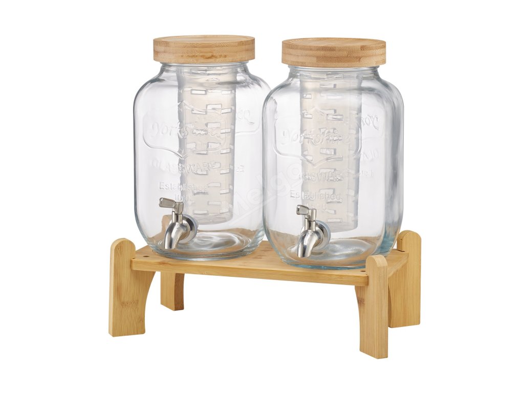 Skleněný dávkovač nápojů 2×3.8l s dřevěným stojanem, nerezový kohoutek