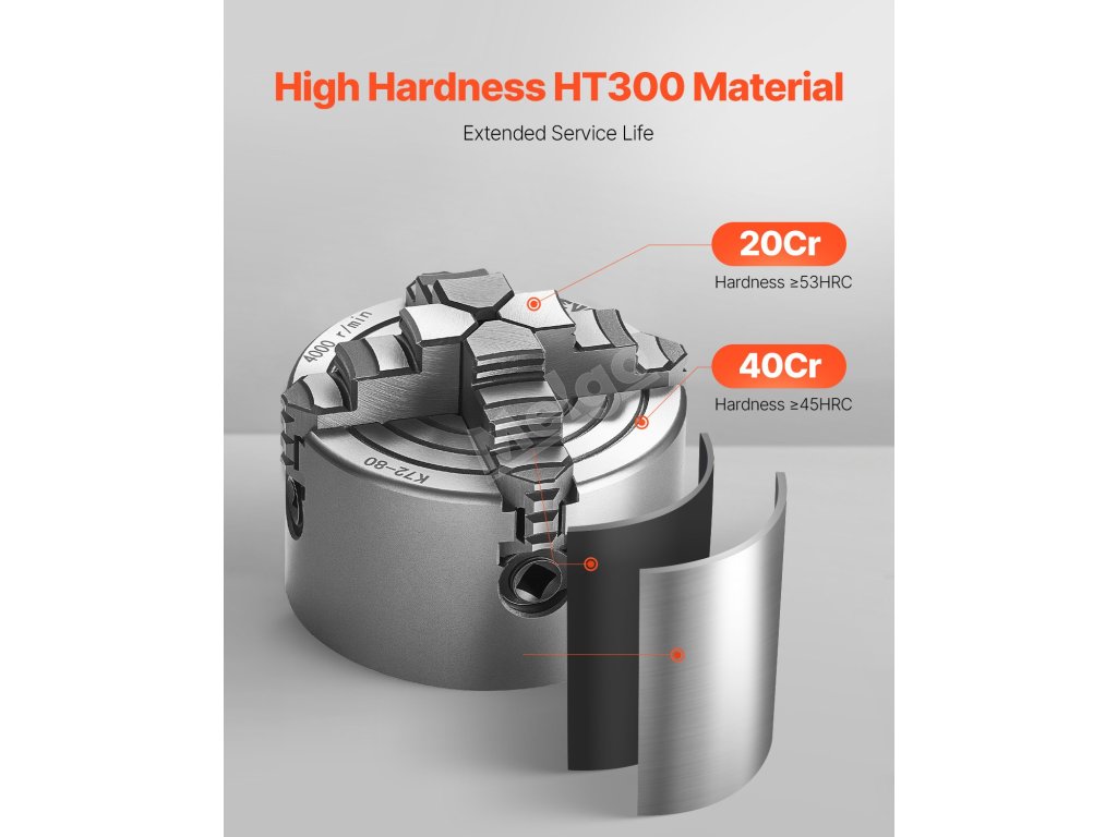 Vyrobeno z prvotřídní litiny HT300, tvrdost čelistí ≥53 HRC pro dlouhou životnost a odolnost proti korozi. Soustružnické sklíčidlo poskytuje vysoce přesné upnutí bez nutnosti kalibrace. S vnitřním průměrem 0,86 palce a vnějším průměrem 3 palce snadno zvládá upínací rozsahy od 0,1 do 3,15 palce.