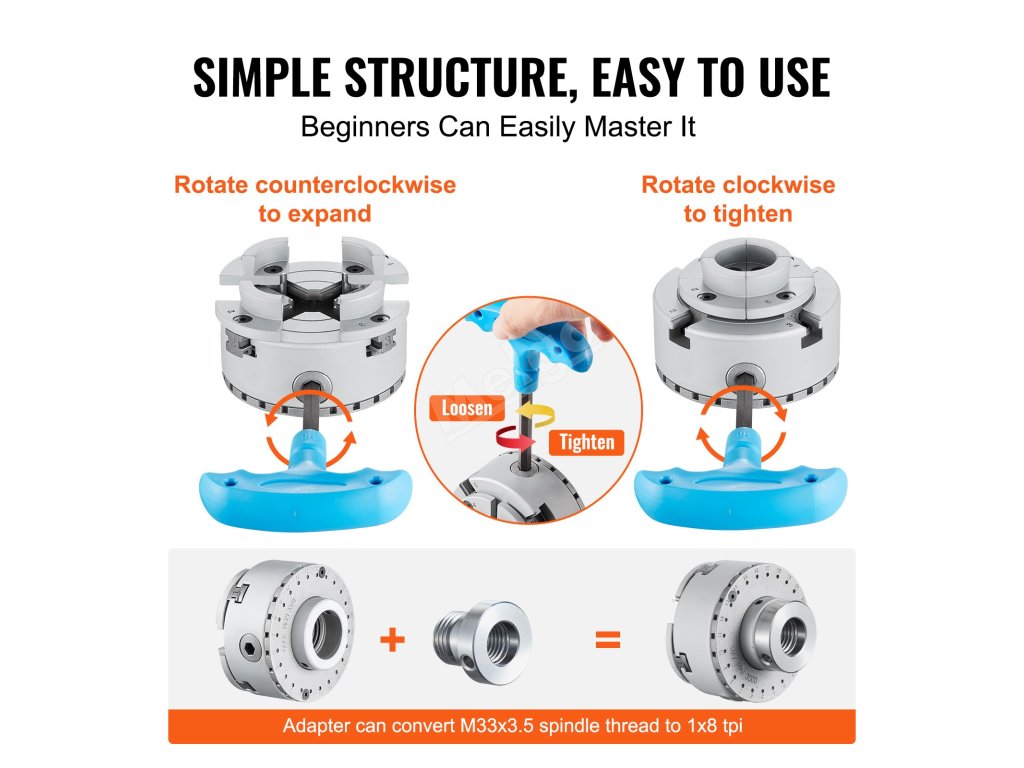 Jako klíčová součást soustruhu hraje sklíčidlo díky své flexibilitě a pohodlí významnou roli při zvyšování efektivity práce. Naše sklíčidlo má nastavitelné rozměry. Jednoduchým otočením klíče ve tvaru T může obsluha sklíčidlo bez námahy vysunout a upnout.