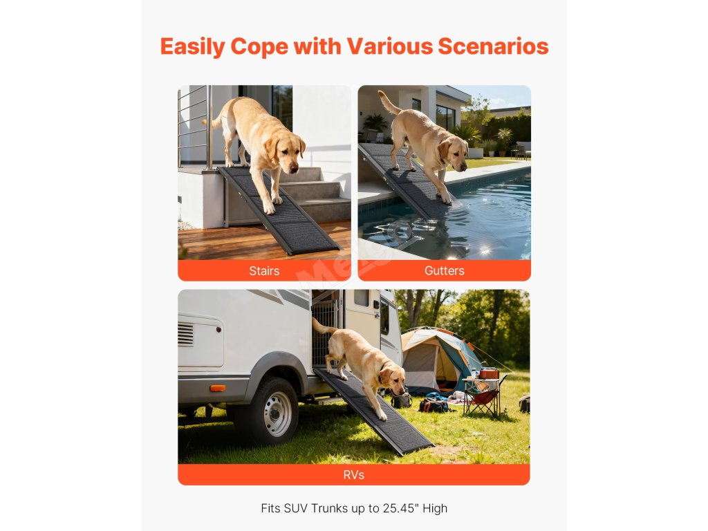 Velká rampa pro psy je ideální pro auta, vnitřní schody, venkovní schody, karavany nebo bazény. Snižuje zátěž kloubů, zajišťuje bezpečný a pohodlný pohyb domácích mazlíčků v jakémkoli prostředí a poskytuje vám klid během vycházek.