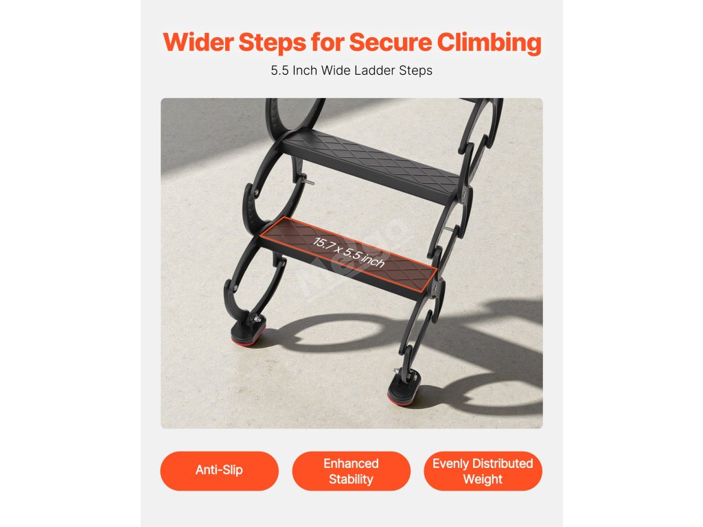 Tento žebřík je vyroben z vysoce pevné legované oceli se stabilním X-rámem a opěrnými tyčemi a unese až 660 kg. Stupně široké 5,5 palce usnadňují výstup a přiložená tažná tyč zajišťuje bezproblémové ovládání.
