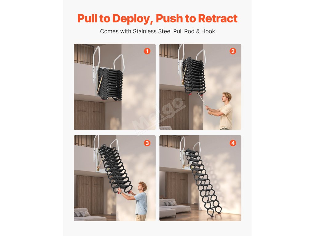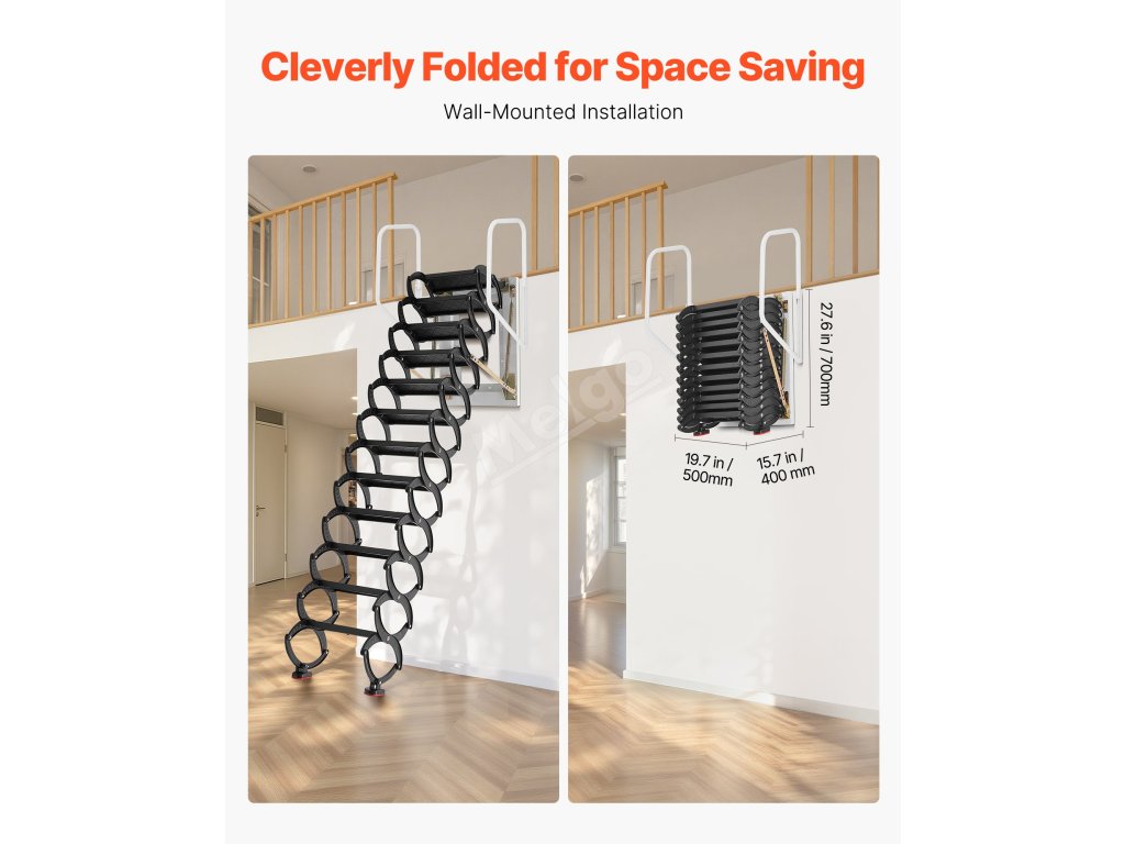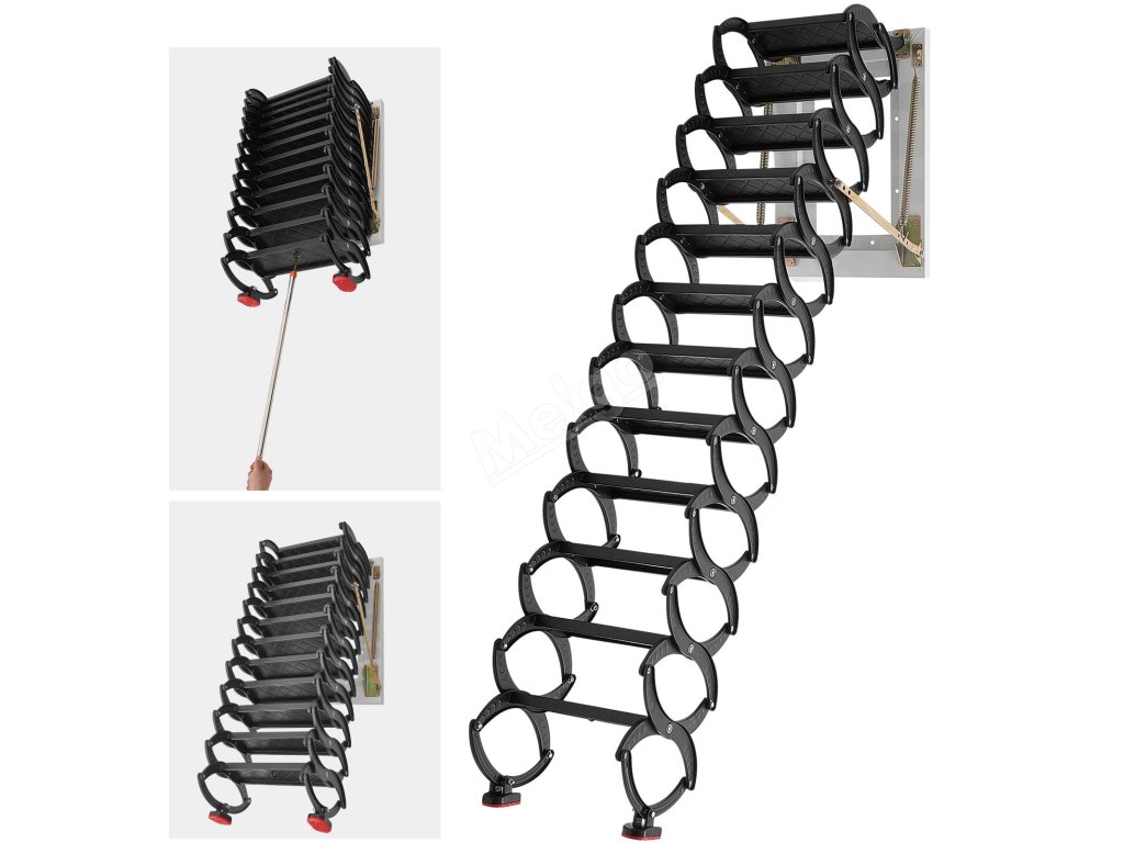 Tento nástěnný výsuvný půdní žebřík obsahuje 2 odnímatelné schůdky a nabízí 3 montážní výšky: 9.Dodává se s podrobným návodem pro snadnou montáž.