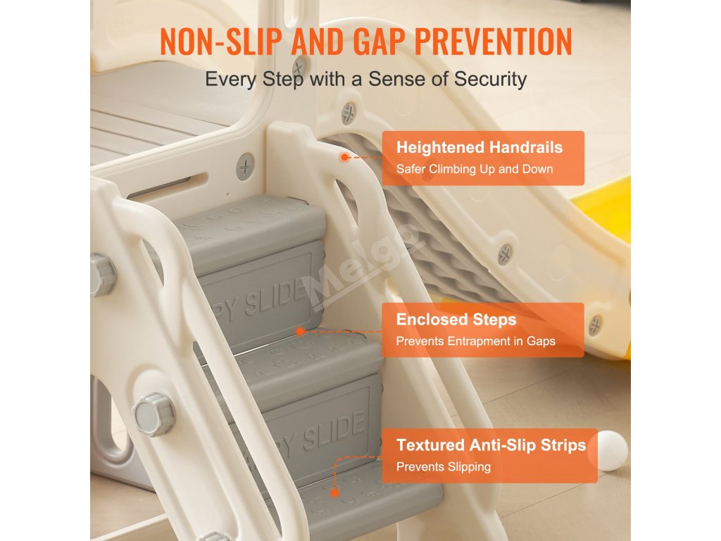 Klapka ve tvaru kachny zabraňuje tomu, aby se dítě při zkoumání zaseklo, a nárazník na skluzavce zabraňuje pádům. zakřivená konstrukce o 360° a vyvýšená madla poskytují dětem plnohodnotnou zábavu.