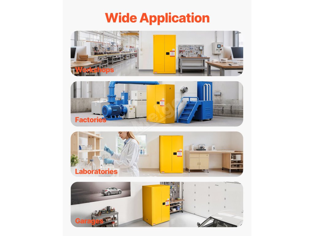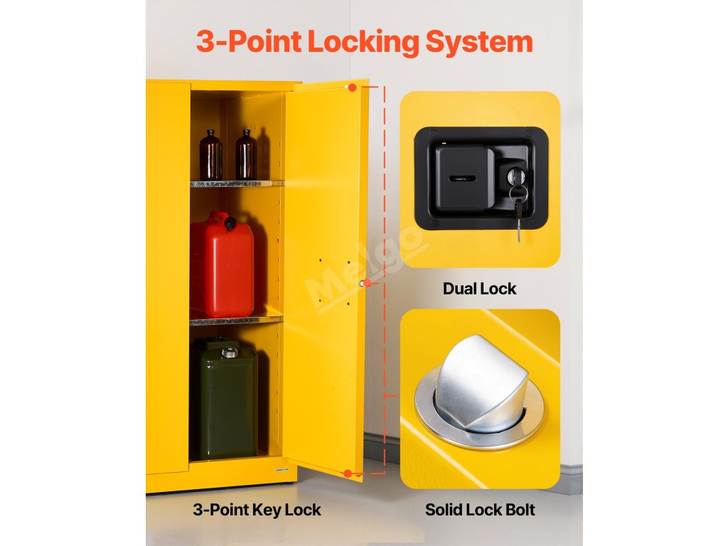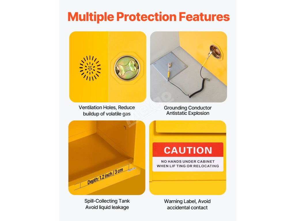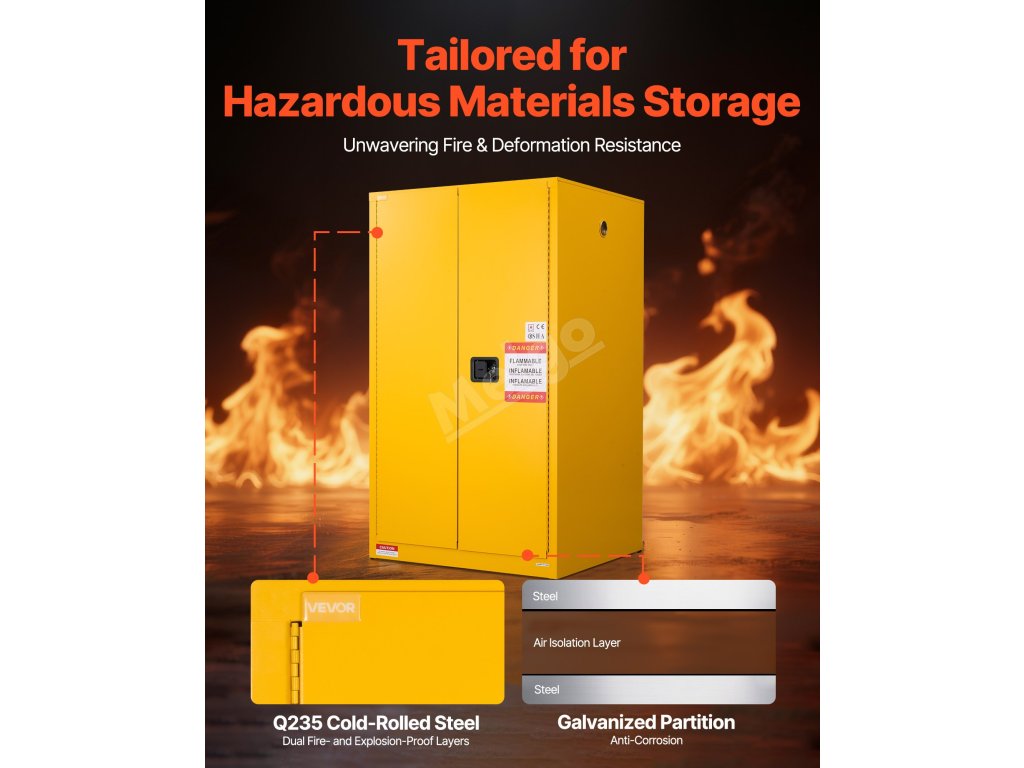 Naše 65galonová skříň vyrobená z oceli válcované za studena Q235 se svařovaným tělem je trvanlivá a odolná proti korozi a deformaci. Je vybavena větracími otvory, záchytnou vanou a uzemňovacím vodičem, který zabraňuje výbuchu a statické elektřině. Vhodná pro skladování různých hořlavých materiálů v dílnách, továrnách a garážích.