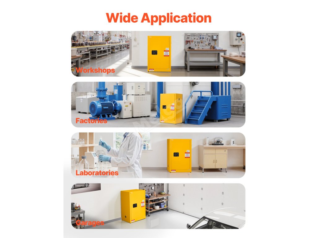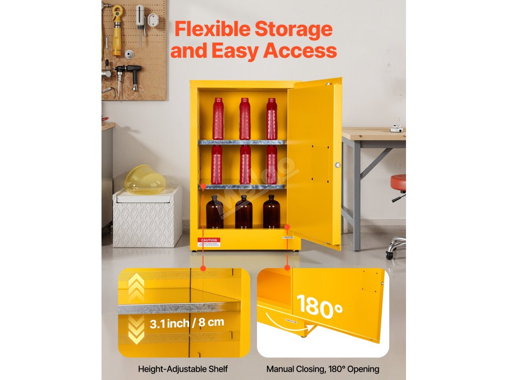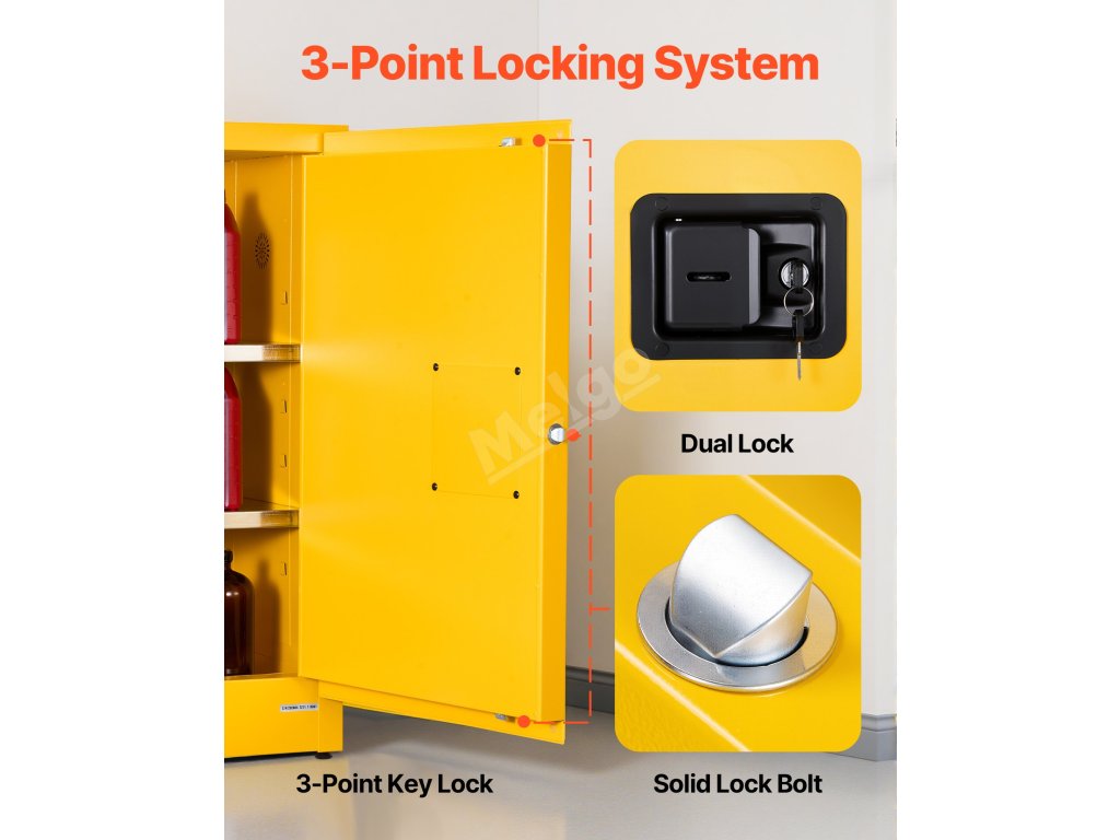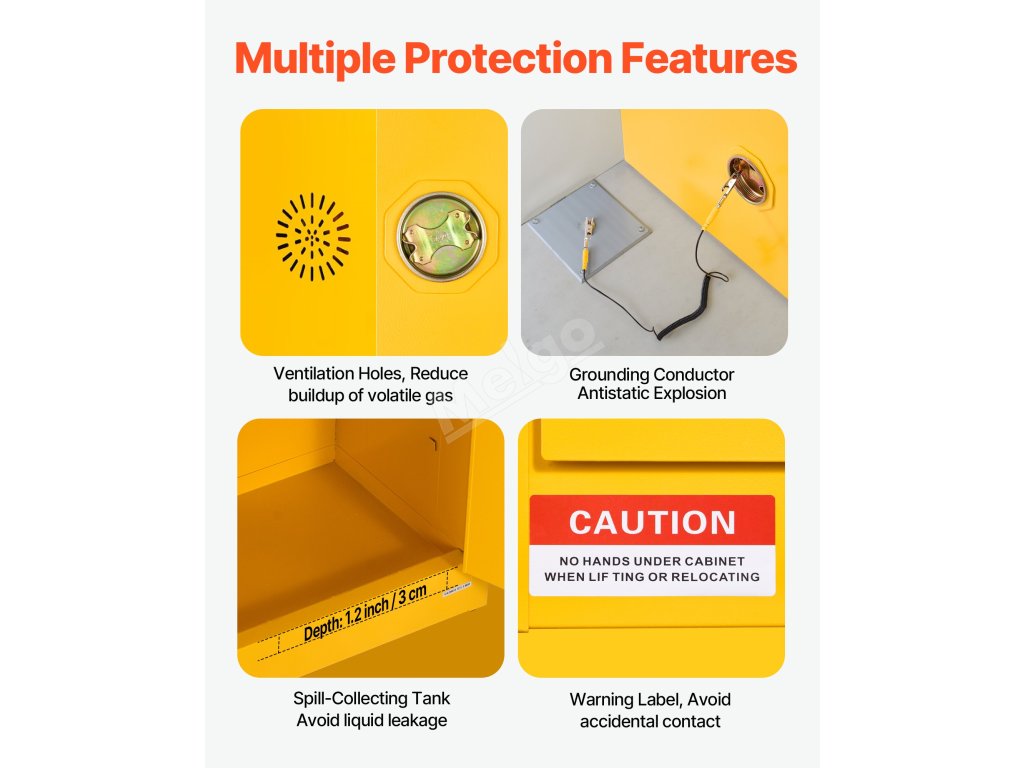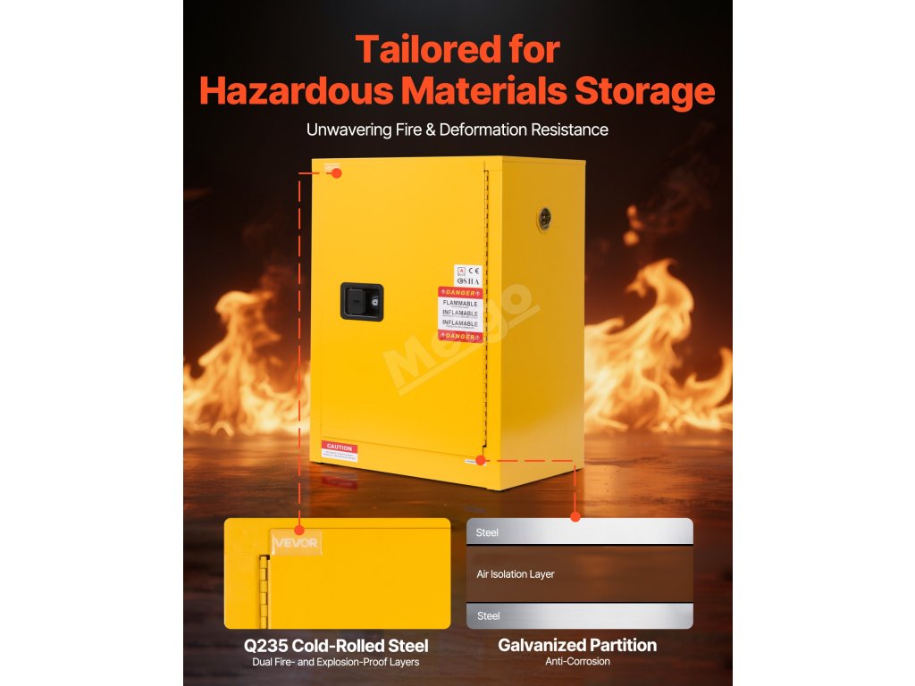 Naše 13galonová skříň vyrobená z oceli válcované za studena Q235 se svařovaným tělem je trvanlivá a odolná proti korozi a deformaci. Je vybavena větracími otvory, vanou a uzemňovacím vodičem, aby se zabránilo výbuchu a statické elektřině. Vhodná pro skladování různých hořlavých materiálů v dílnách, továrnách a garážích.