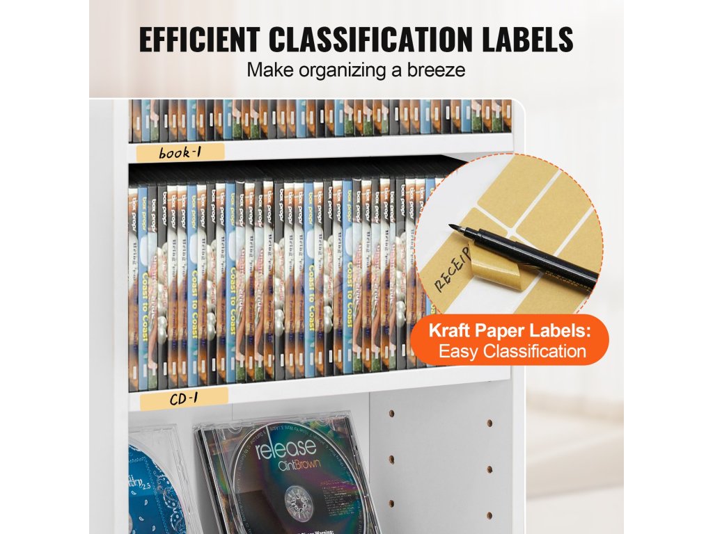 Dodává se s kraftovými klasifikačními štítky, které usnadňují identifikaci a vyhledávání disků DVD a šetří čas při hledání v nepřehledných položkách.
