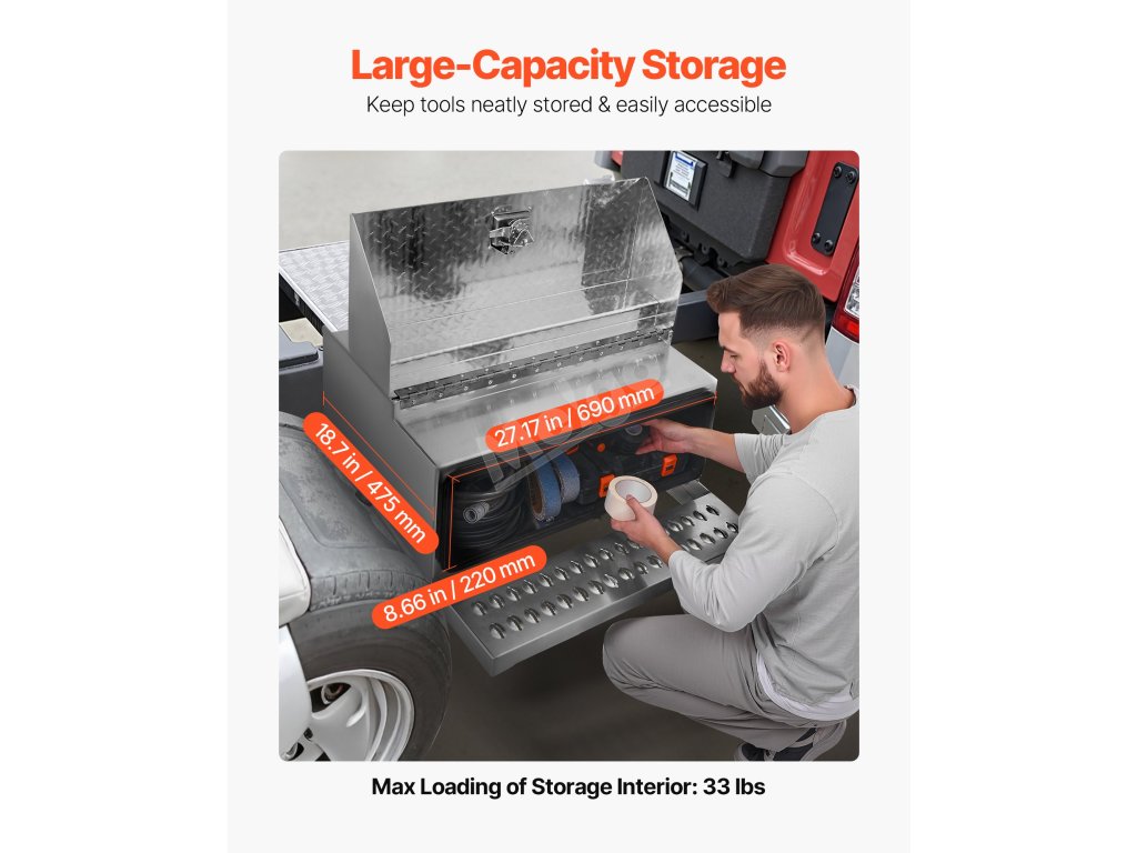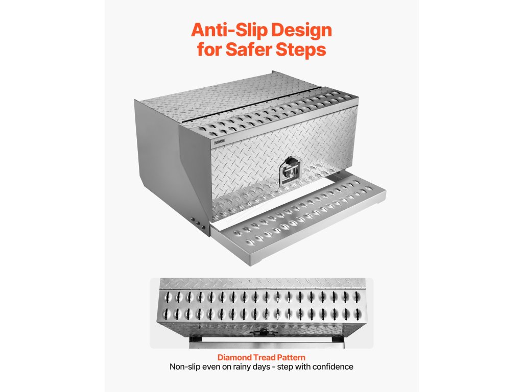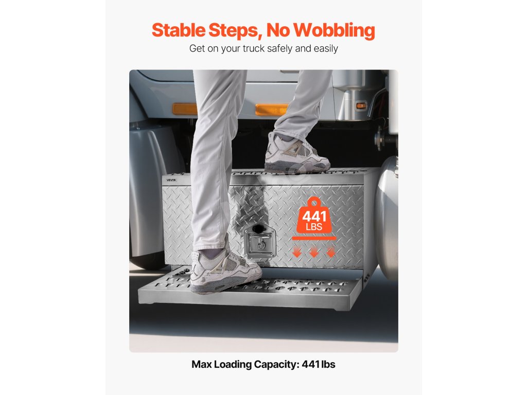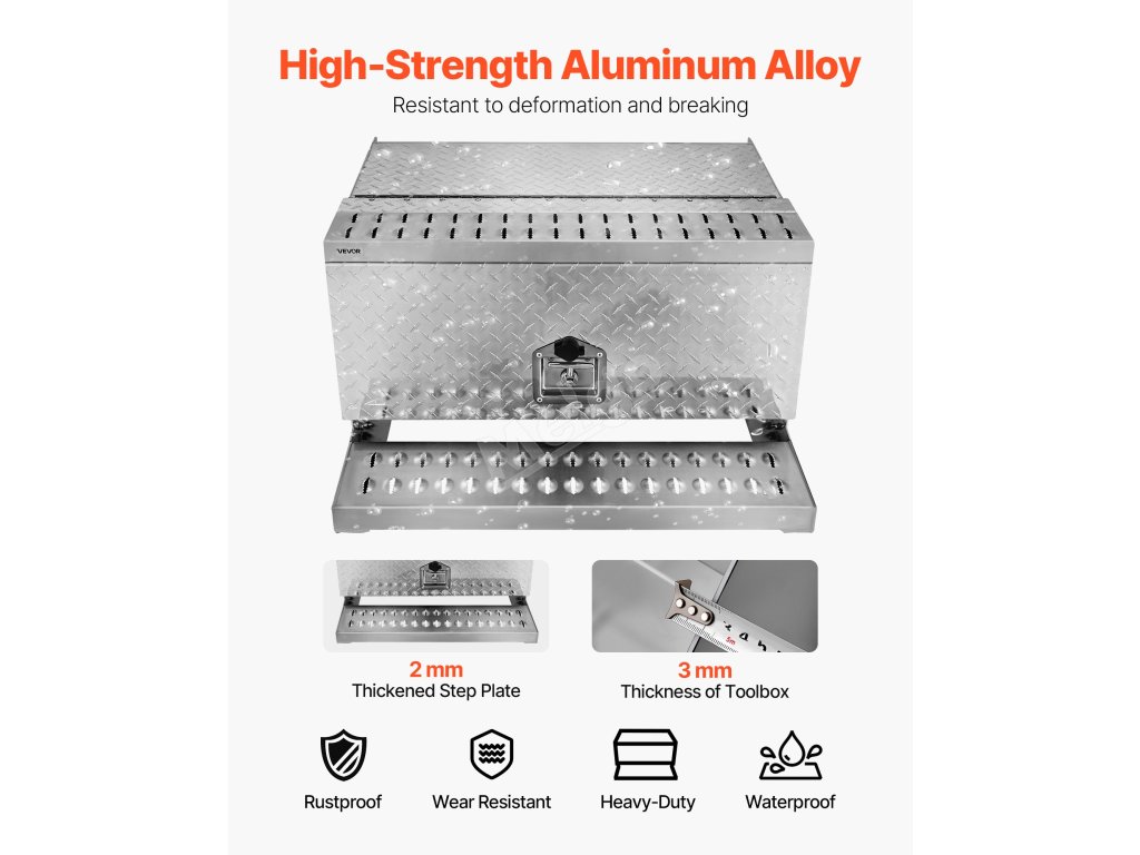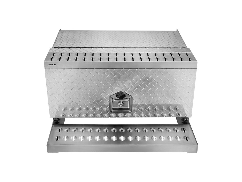 Skříň na nářadí VEVOR se schůdky pro návěsy kombinuje odolnou konstrukci, bezpečné schůdky a bezpečné uložení v jednom univerzálním zařízení. Je vyrobena z vysoce odolné hliníkové slitiny, unese až 200 kg, což zajišťuje stabilní nastupování a vystupování řidičů, a má prostorný vnitřní úložný prostor s uzamykáním a přístupem na klíč.