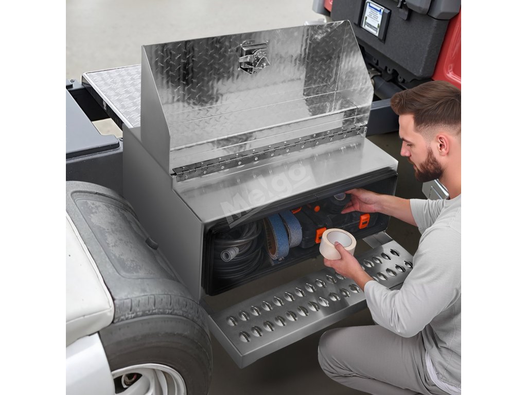 Tento hliníkový stupňovitý box na nářadí o rozměrech 760 x 750 x 400 mm, vyrobený z 2 mm silných stupňovitých desek a 3 mm silného těla boxu, nabízí robustní konstrukci odolnou proti deformacím a kývání, která unese zatížení až 200 kg.