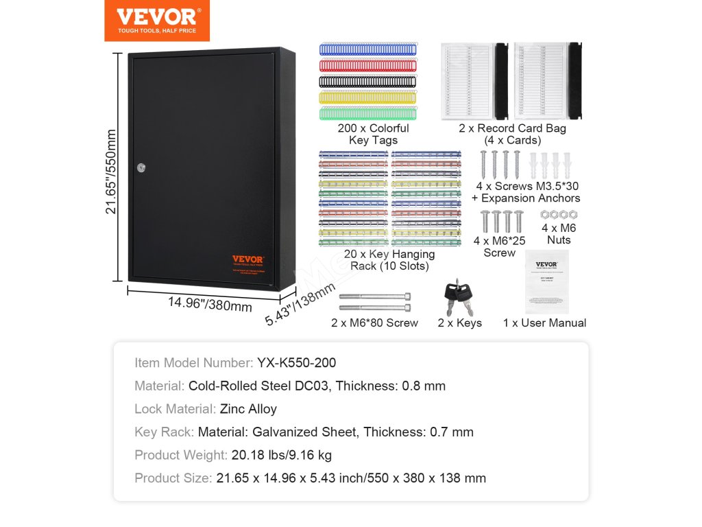 Tato skříňka na klíče je vyrobena z oceli válcované za studena, odolné proti korozi, a vyznačuje se dlouhou životností. 0.panel skříňky o tloušťce 8 mm odolá nárazům a tlaku při každodenním používání a zajistí bezpečné uložení klíčů.