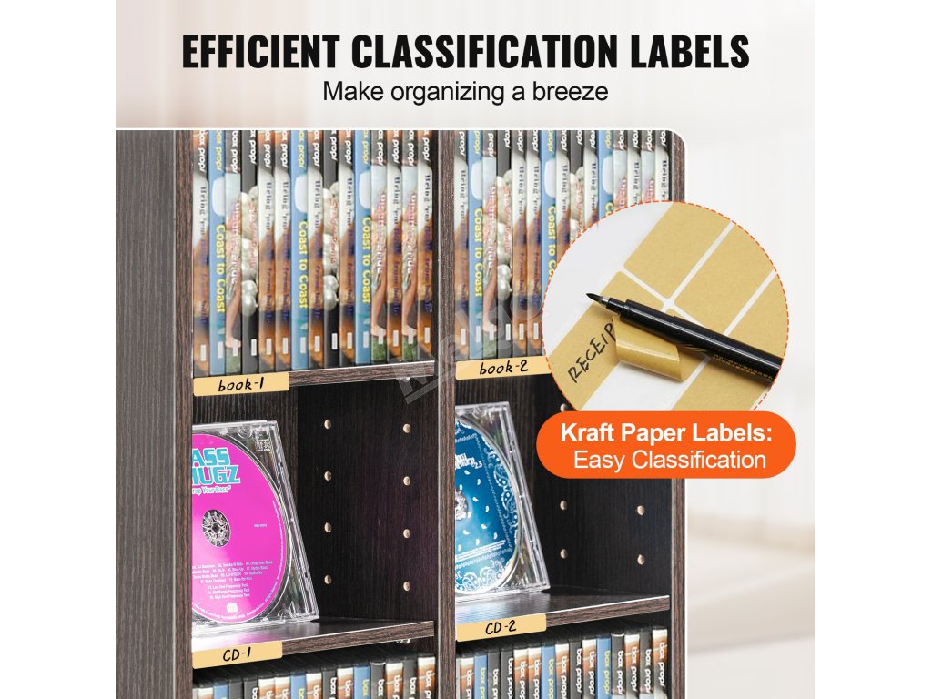 Dodává se s kraftovými klasifikačními štítky, které usnadňují identifikaci a vyhledávání disků DVD a šetří čas při hledání v nepřehledných položkách.