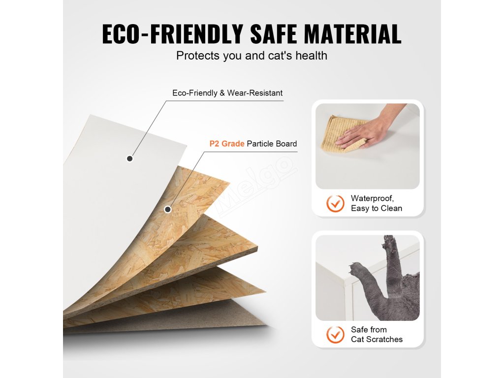 Je vyrobena z dřevotřískové desky třídy P2, je odolná a zajišťuje zdraví vás i vašich domácích mazlíčků. Vysoce kvalitní povrchová úprava je voděodolná a není snadné ji poškodit poškrábáním kočkou. Dokonce i kočičí moč nebo jiné skvrny lze snadno setřít, což značně usnadňuje každodenní údržbu.