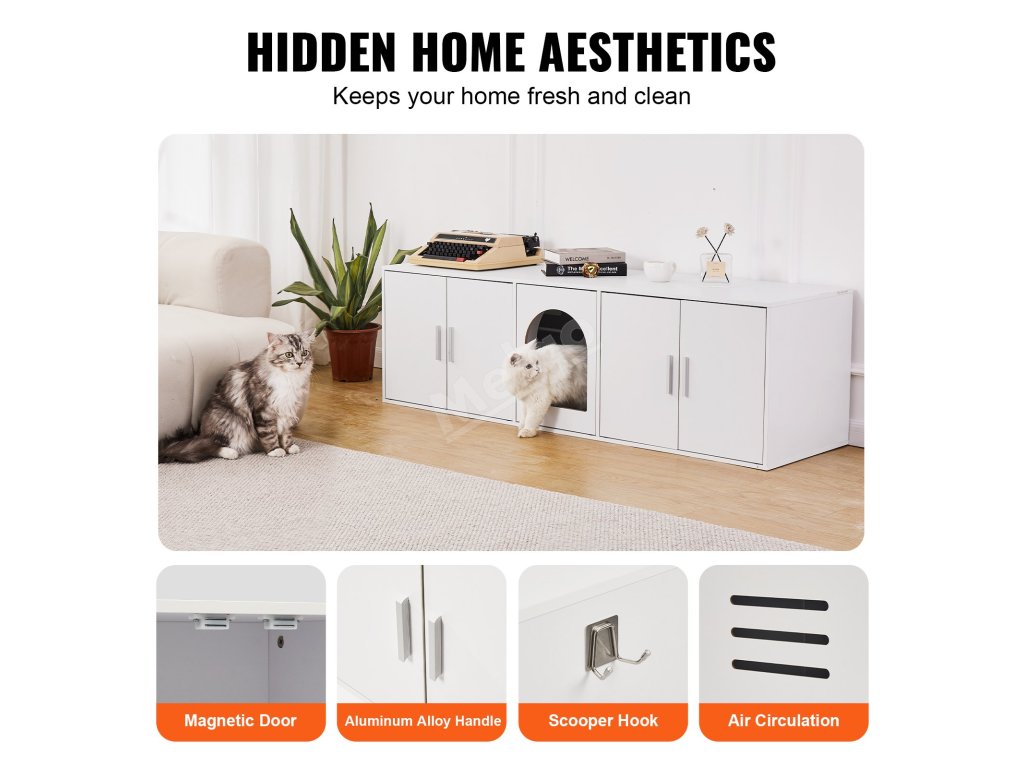 Tato ohrádka pro kočky, která poskytuje soukromý a útulný prostor pro vaši kočku, nejen účinně skrývá záchod, ale také udržuje čerstvý vzduch. Jeho elegantní design dokonale ladí s interiérem vašeho domova a je praktický i krásný, protože umožňuje umístění dekorativních i každodenních předmětů.