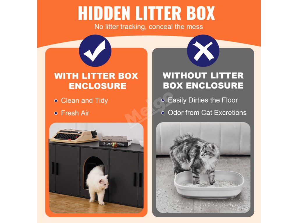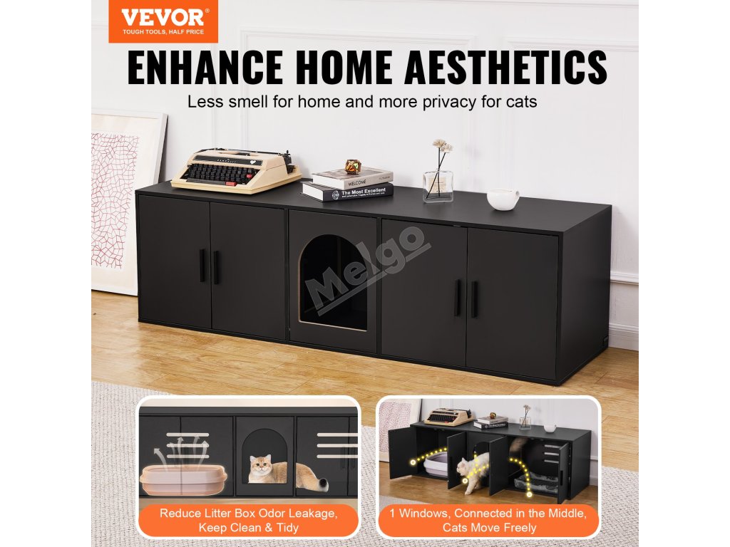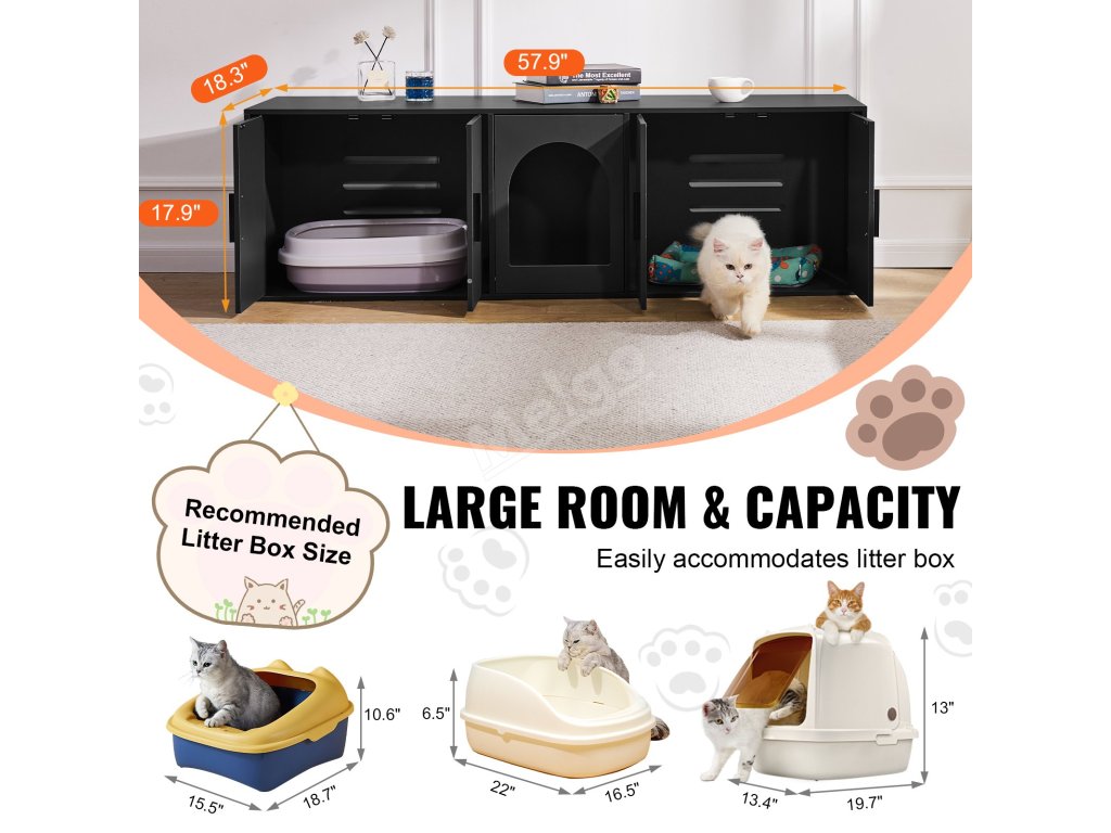 Velký prostor se třemi vchody umožňuje vaší kočce volný přístup a většina psů se do něj nedostane, takže vaše kočka bude v bezpečí a v soukromí. Nezáleží na tom, jakou velikost steliva používáte, tento nábytek pro kočky se do něj dokonale vejde a poskytne dostatek prostoru pro pohyb.