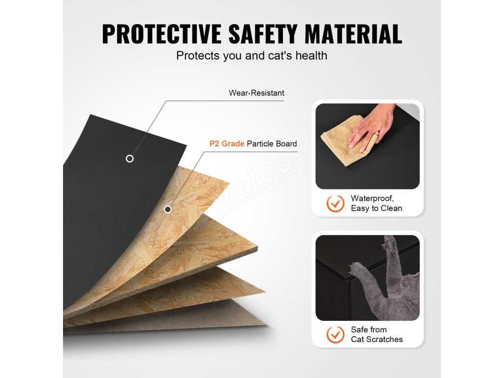 Je vyrobena z dřevotřískové desky třídy P2, je odolná a zajišťuje zdraví vás i vašich domácích mazlíčků. Vysoce kvalitní povrchová úprava je voděodolná a není snadné ji poškodit poškrábáním kočkou. Dokonce i kočičí moč nebo jiné skvrny lze snadno setřít, což značně usnadňuje každodenní údržbu.