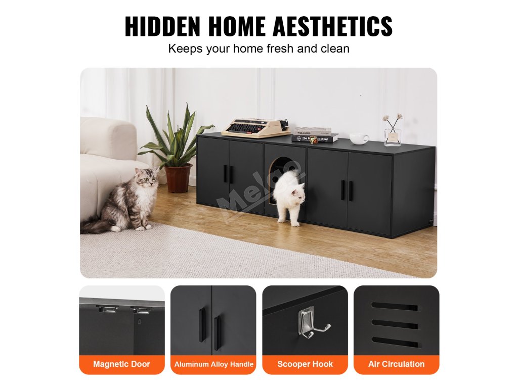 Tato ohrádka pro kočky, která poskytuje soukromý a útulný prostor pro vaši kočku, nejen účinně skrývá záchod, ale také udržuje čerstvý vzduch. Jeho elegantní design dokonale ladí s interiérem vašeho domova a je praktický i krásný, protože umožňuje umístění dekorativních i každodenních předmětů.