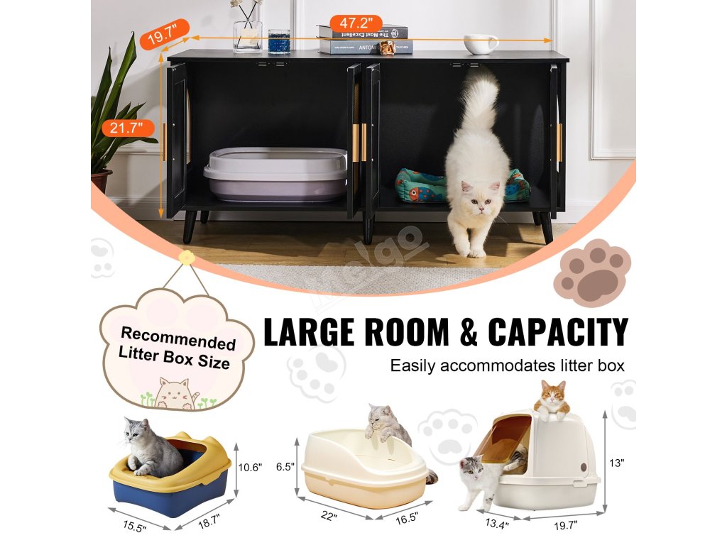 Velký prostor se dvěma okny umožňuje kočce volný přístup a většina psů se do něj nedostane, takže vaše kočka bude v bezpečí a v soukromí. Nezáleží na tom, jakou velikost steliva používáte, tento nábytek pro kočky se do něj dokonale vejde a poskytne dostatek prostoru pro pohyb.