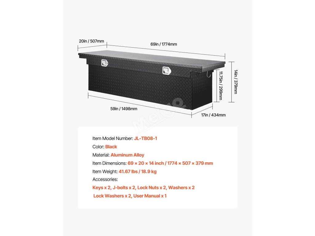 Tento box na nářadí pro nákladní vozidla je vyroben z vysoce kvalitního hliníku o tloušťce 1,5 mm (0,058 palce), je pevný a odolný a unese až 110 liber (50 kg). Je navržen tak, aby odolával nerovnostem na silnicích, a zaručuje dlouhodobou stabilitu a spolehlivý výkon.