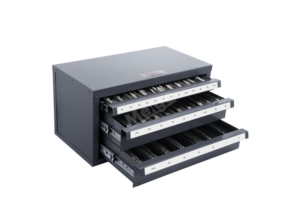 Tato skříňka na nože je vybavena třemi prostornými zásuvkami, které pojmou nože od 1/8" do 1" s celkem 29 přihrádkami. Každá přihrádka pojme jednu čelní frézu nebo jiné příslušenství. Tyto přihrádky poskytují přehledné pozice pro různé velikosti a typy.