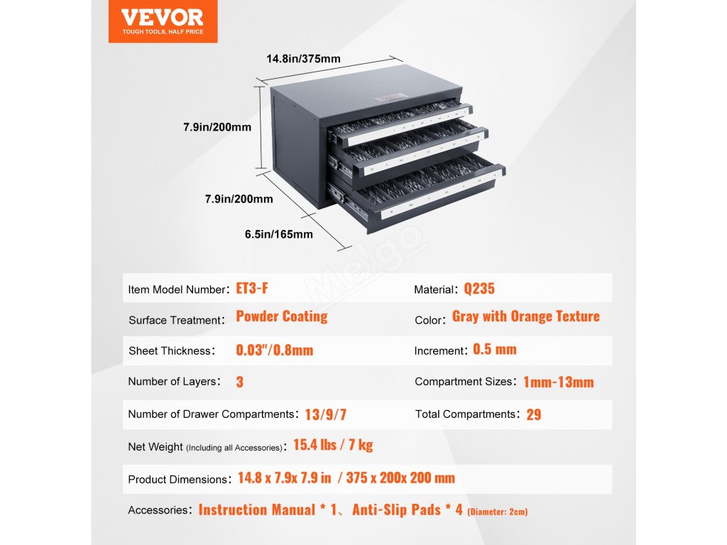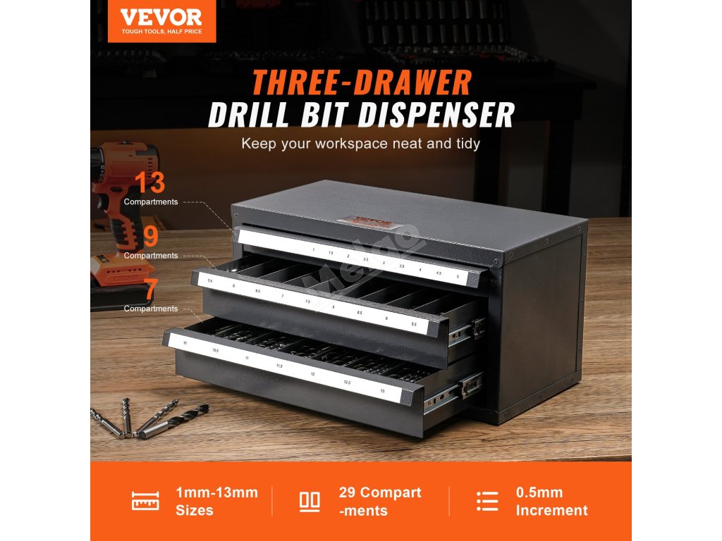 Tato skříňka na vrtáky má tři prostorné zásuvky, které pojmou vrtáky od 1 mm do 13 mm s celkem 29 přihrádkami. Každá přihrádka pojme jeden vrták nebo jiné příslušenství. Tyto přihrádky poskytují přehledné pozice pro různé velikosti a typy.