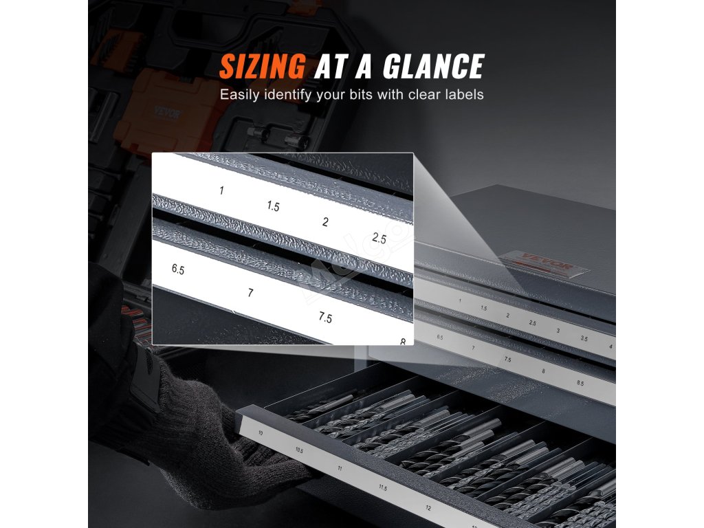 Díky přehlednému označení velikosti můžete rychle vybrat a použít správný vrták pro danou práci a zvýšit tak efektivitu práce. Udržování pořádku ve skříňce na nářadí nebo v úložné skříňce zajistí čistší a profesionálnější pracovní prostor.