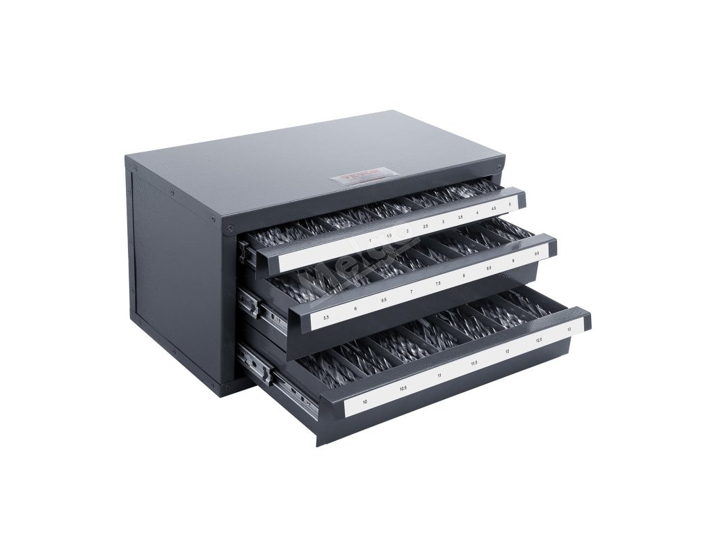Skříňka na vrtáky 3 zásuvky 1–13 mm ocelová s popisky stohovatelná