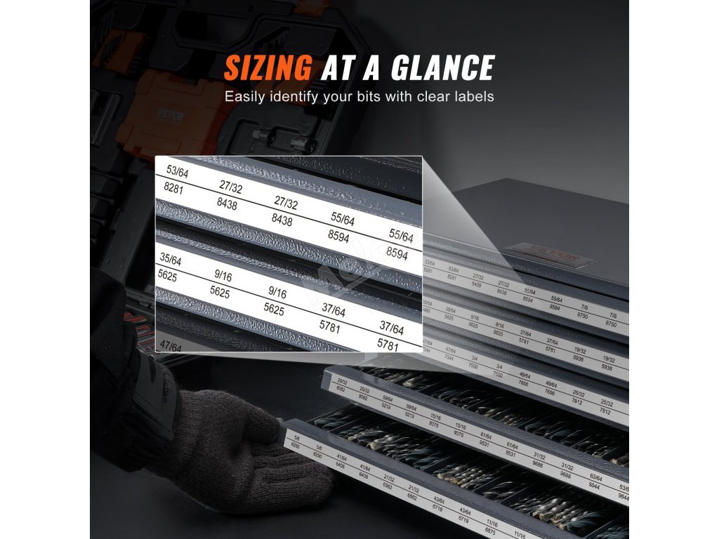 Díky přehlednému označení velikosti můžete rychle vybrat a použít správný vrták pro danou práci a zvýšit tak efektivitu práce. Udržování pořádku ve skříňce na nářadí nebo v úložné skříňce zajistí čistší a profesionálnější pracovní prostor.
