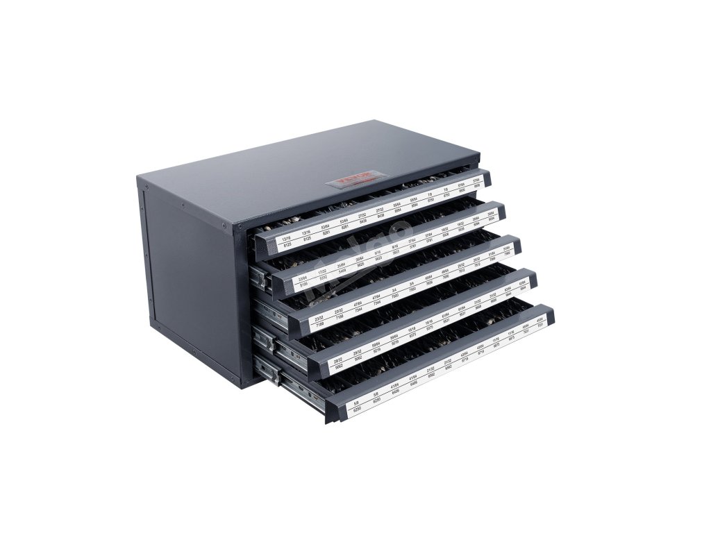 Tato skříňka na vrtáky má pět prostorných zásuvek, které pojmou vrtáky o průměru od 33/64" do 63/64" a celkem 60 přihrádek. Každá přihrádka pojme jeden vrták nebo jiné příslušenství. Tyto přihrádky poskytují přehledné pozice pro různé velikosti a typy.