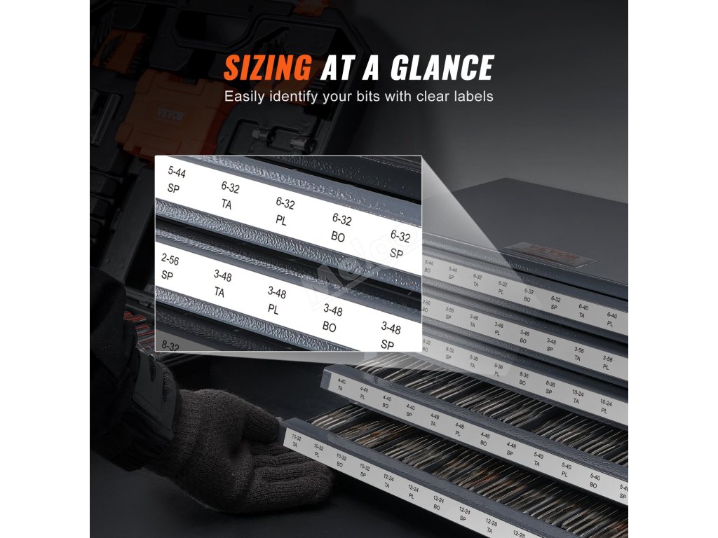 Díky přehledným štítkům s velikostí můžete rychle vybrat a použít správný kohoutek pro danou práci a zvýšit tak efektivitu své práce. Udržování pořádku a organizace ve skříňce na nářadí nebo v úložné skříňce zajišťuje čistší a profesionálnější pracovní prostor.