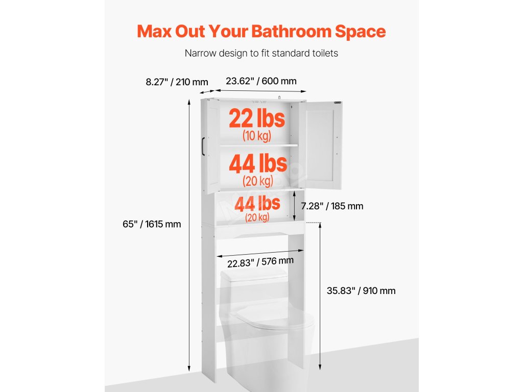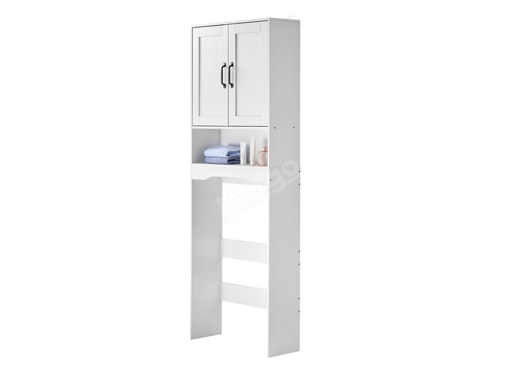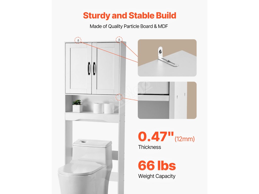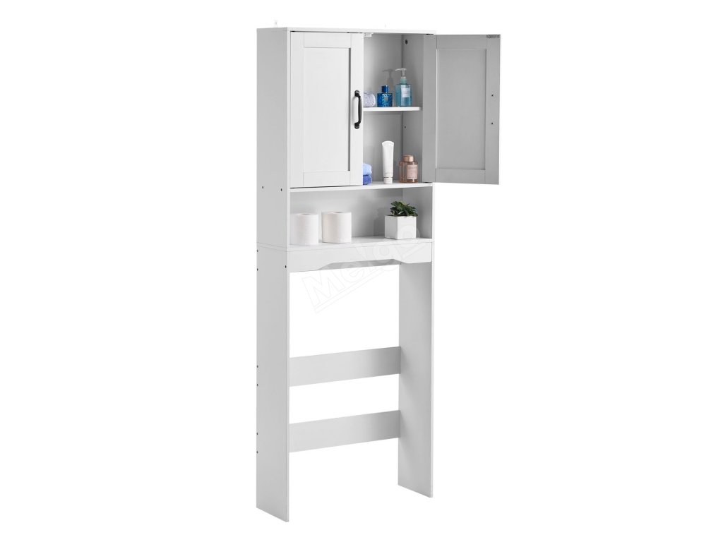 Tato skříňka se hodí nad standardní toalety, aby se ušetřilo místo. Je vyrobena z dřevotřísky a MDF a unese až 66 kg. Je vybavena sadou proti převrácení, víceúrovňovým úložným prostorem a nastavitelnými policemi. Čistý design se hodí do každého interiéru.