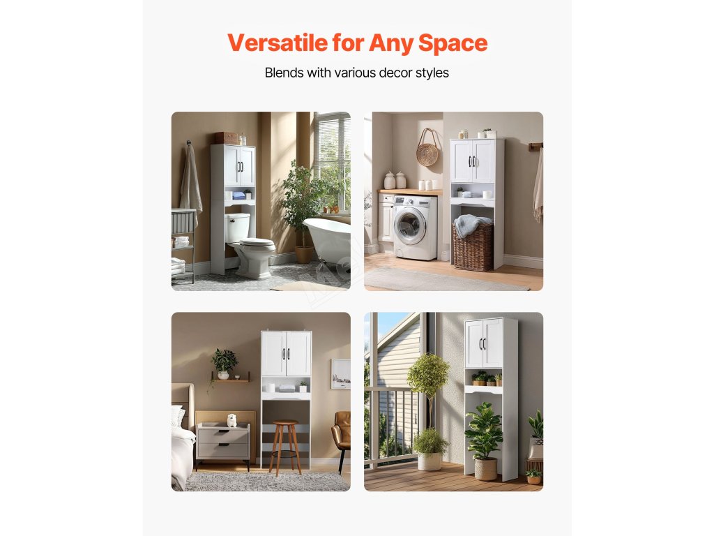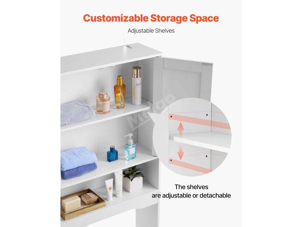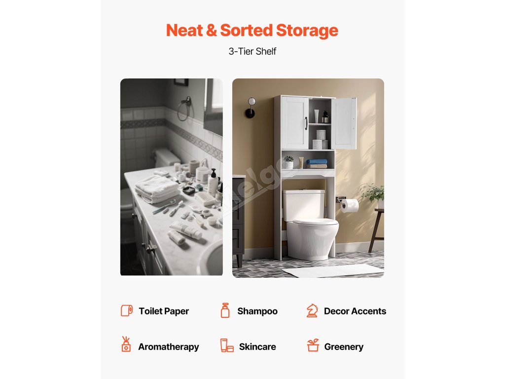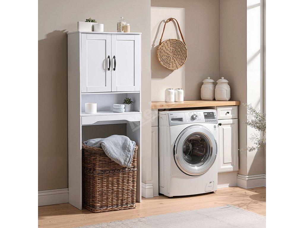 Tato skříňka se hodí nad standardní toalety, aby se ušetřilo místo. Je vyrobena z dřevotřísky a MDF a unese až 66 kg. Je vybavena sadou proti převrácení, víceúrovňovým úložným prostorem a nastavitelnými policemi. Čistý design se hodí do každého interiéru.