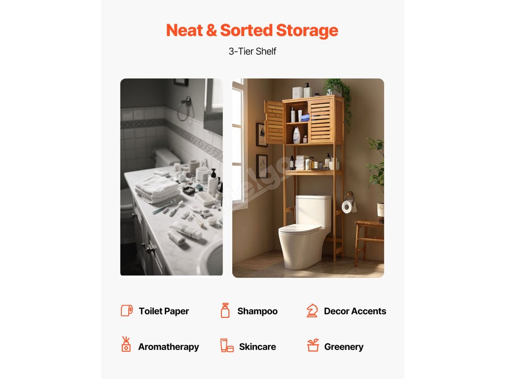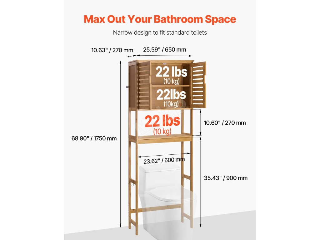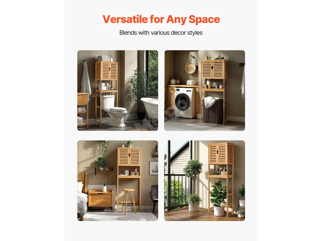 Tato skříňka se hodí nad standardní toalety, aby se ušetřilo místo. Je vyrobena z bambusu a MDF a unese až 22 kg. Je vybavena sadou proti převrácení, víceúrovňovým úložným prostorem a nastavitelnými policemi. Čistý design se hodí do každého interiéru.
